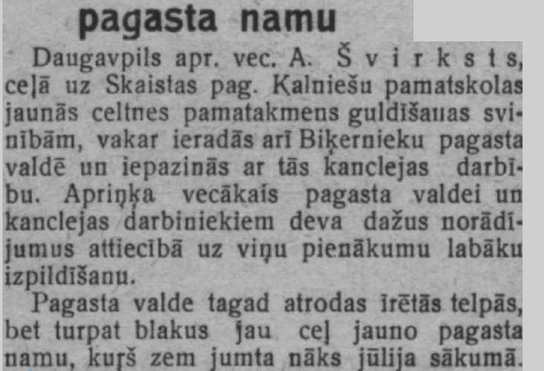Daugavpils apr. vec. A. Švirksts, ceļā uz Skaistas pag. Kalniešu pamatskolas jaunās celtnes pamatakmens guldīšanas svinībām, vakar ieradās arī Biķernieku pagasta valdē un iepazinās ar tās kanclejas darbību. Apriņķa vecākais pagasta valdei un kanclejas darbiniekiem deva dažus norādījumus attiecībā uz viņu pienākumu labāku izpildīšanu. Pagasta valde tagad atrodas īrētās telpās, bet turpat blakus jau ceļ jauno pagasta namu, kurš zem jumta nāks jūlija sākumā. Pie būvdarbiem strādā pagasta iedzīvotāji, kuri nav varējuši nomaksāt pagasta nodokļus; viņi izpelna 3—4 ls dienā un ar darbu ir apmierināti.