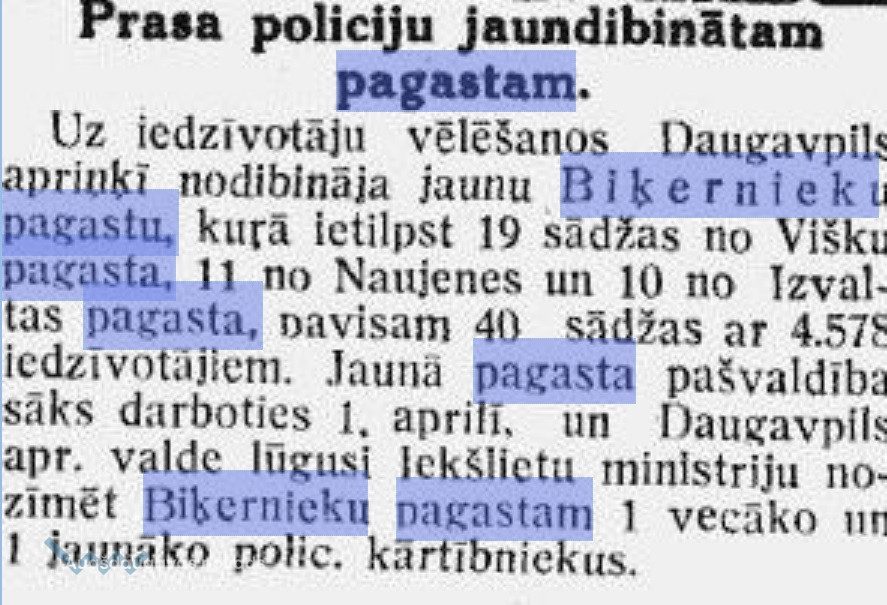 Uz iedzīvotāju vēlēšanos Daugavpils apriņķī nodibināja jaunu Biķernieku pagastu, kura ietilpst 19 sādžas no Višķu pagasta, 11 no Naujenes un 10 no Izvaltas pagasta, pavisam 40 sādžas ar 4.578 iedzīvotājiem. Jaunā pagasta pašvaldība sāks darboties 1. aprilī, un Daugavpils apr. valde lūgusi Iekšlietu ministriju no zīmēt Biķernieku pagastam 1 vecāko un 1 jaunāko polic. kārtībniekus.
