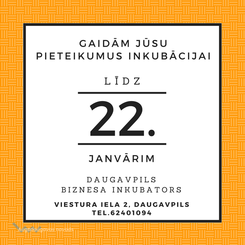 Šobrīd Latvijas Investīciju un attīstības aģentūras (LIAA) Daugavpils biznesa inkubatorā ir atvērta dalībnieku 2018. gada pirmās kārtas pieteikumu pieņemšana uzņemšanai inkubācijā, kas noslēgsies šī gada 22. janvārī. Pieteikšanās pirmsinkubācijai notiek nepārtraukti, un tajā var pieteikties arī fiziskas personas.