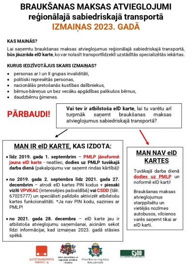 Atsevišķas pasažieru kategorijas ir tiesīgas saņemt braukšanas maksas atvieglojumus maršrutu tīkla maršrutos. Atbilstoši normatīvajos aktos noteiktajai kārtībai, kas stāsies spēkā 2023. gada 1.pusgadā, pasažieru kategorijas, kuras ir tiesīgas izmantot braukšanas maksas atvieglojumus reģionālās nozīmes maršrutos (piemēra, Rīga-Ogre, Jēkabpils-Viesīte-Sauka-Rite-Nereta u.tml.), sabiedriskajā transportlīdzeklī identificējas elektroniski ar personas apliecību (eID karti), kas papildināta ar speciālu funkcionalitāti (lietotni).
