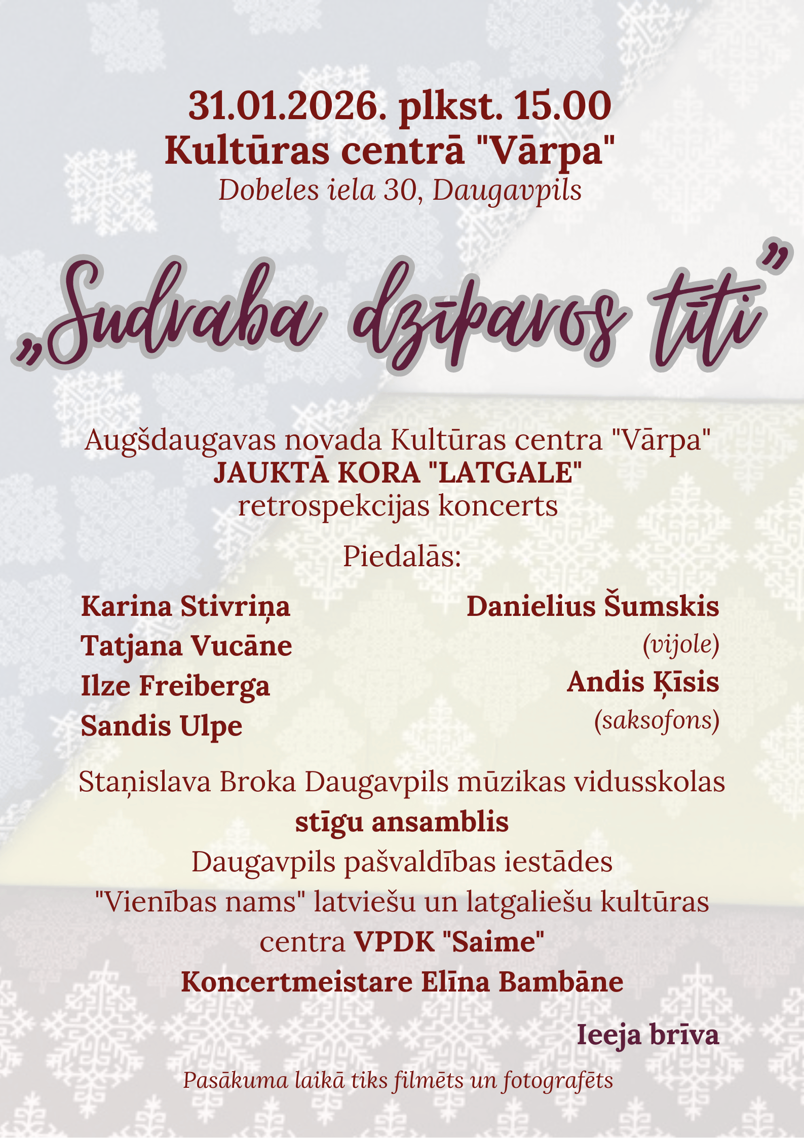 Koncerts notiks 31. janvārī plkst. 15.00 KC “Vārpa”. Ieeja brīva.