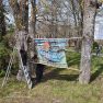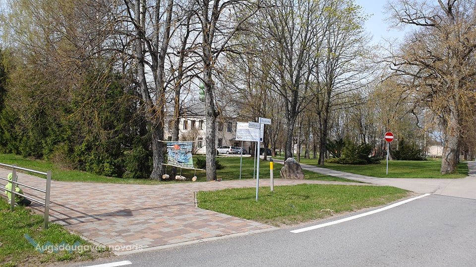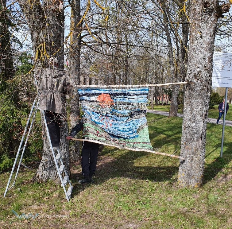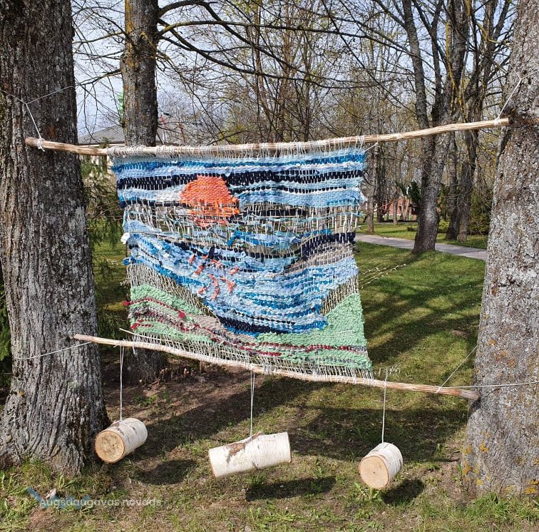 Darbā arī bija izmantoti zari, kuri savienoja dabas materiālus ar audumu un piešķīra vairāk dabīguma. Gleznu svinīgi mēs izvietojām pie Tautas nama starp diviem kokiem pie galvenā ceļa, lai katram būtu iespēja to baudīt braucot caur Medumiem!