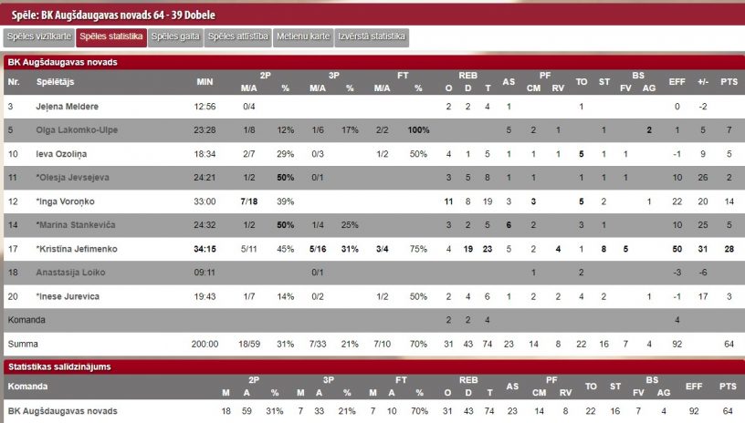 Novada komandā spēles rezultatīvākā spēlētāja – Kristīna Jefimenko kura guva 28 punktus un zem groziem izcīnīja 23 atlēkušās bumbas. Inga Voroņko pievienoja 14 punktus, Olga Lakomko-Ulpe – 7 punkti. Viesu komandā 23 punktus guva Dita Krecere.