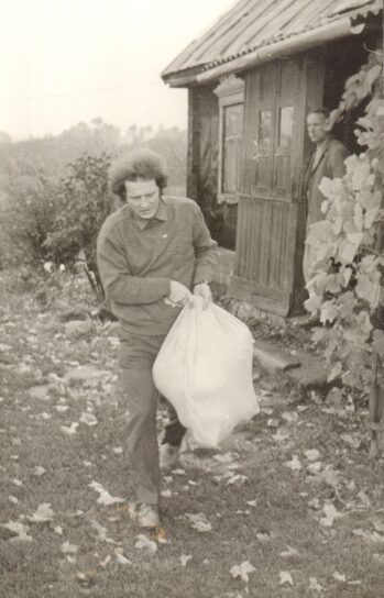 Dainis Īvāns ar kāpostu maisu sievasmātes Romualdas Lielauses mājas pagalmā. Mājas durvīs stāv sievasmātes vīrs Valentīns Lielausis. Naujenes pagasts, Sprukti, 20 gs. 2.puse. Fotogrāfs Atis Ieviņš