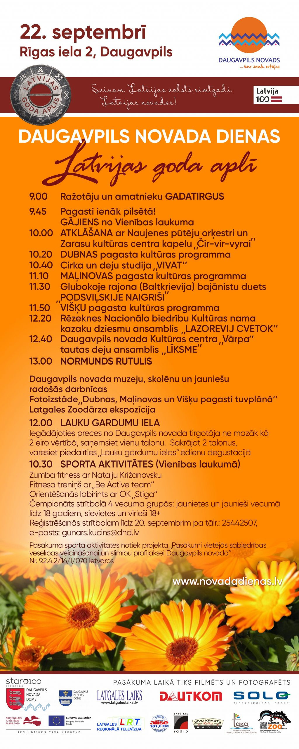 Daugavpils novada dienas 2018 noritēs festivāla “Latvijas goda aplis” ietvaros. Festivāls “Latvijas Goda aplis” ir viens no Latvijas valsts simtgades programmas notikumiem. To rīko biedrība “Staro100” sadarbībā ar novadu pašvaldībām, kultūras centriem un namiem, nevalstiskām organizācijām, novadu iedzīvotājiem un uzņēmējiem, Kultūras ministrijas Latvijas valsts simtgades biroju.