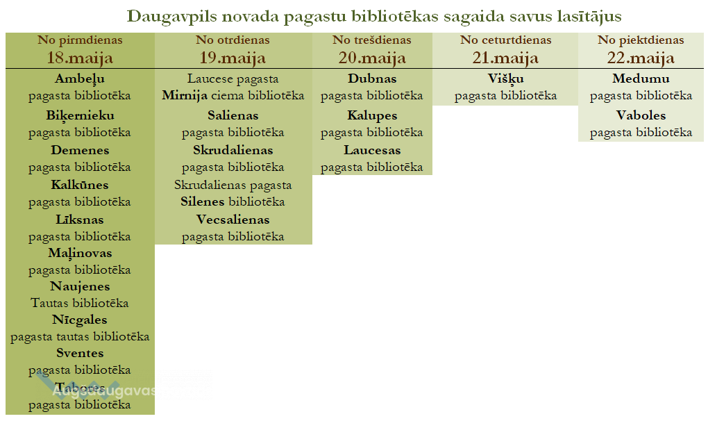 Daugavpils novada pagastu bibliotēkas un to apkalpošanas punkti no 18. maija pakāpeniski atsāk lietotāju apkalpošanu klātienē, nodrošinot atsevišķus bibliotekāros pamatpakalpojumus un nosakot to saņemšanas nosacījumus, ievērojot valdības noteiktos ierobežojumus, drošības pasākumus un Kultūras ministrijas izstrādāto sanitāro protokolu.