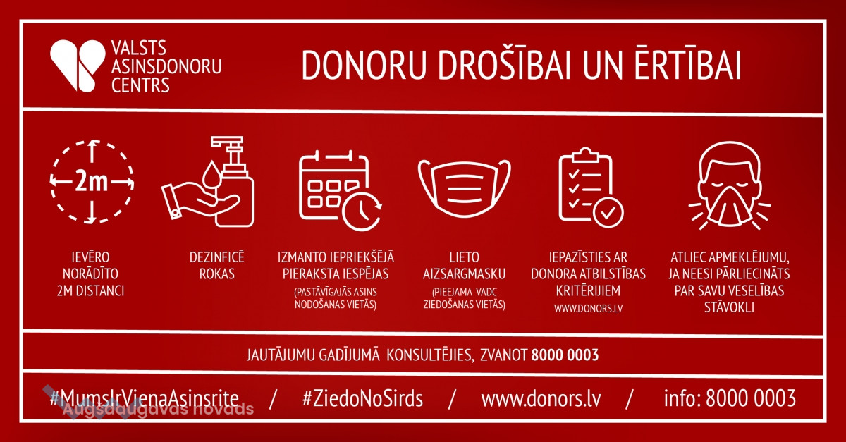 VADC aicina ikvienu asins nodošanas vietu apmeklētāju būt atbildīgam un ievērot valdības noteiktos epidemioloģiskos pasākumus, lai ierobežotu Covid-19 izplatību.