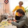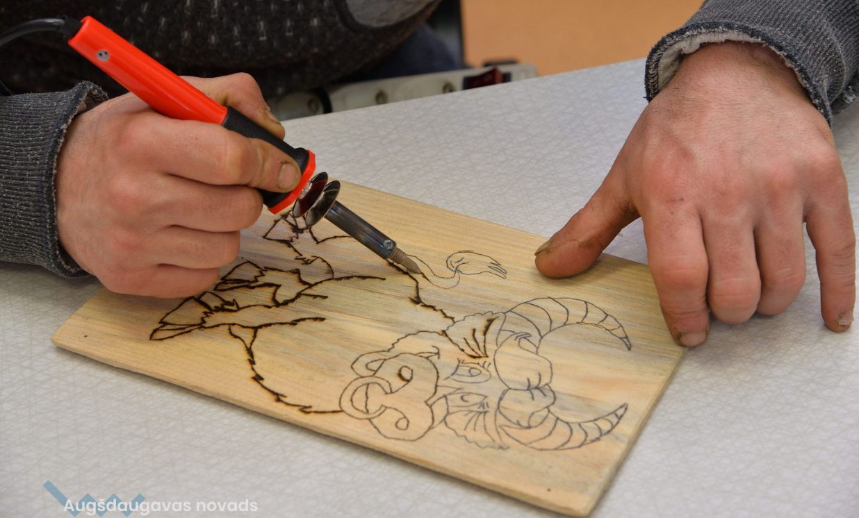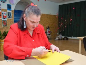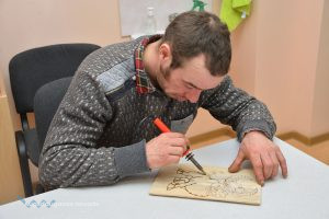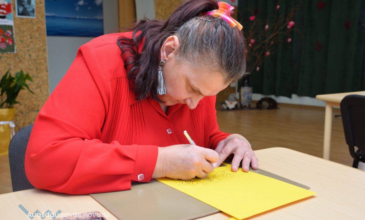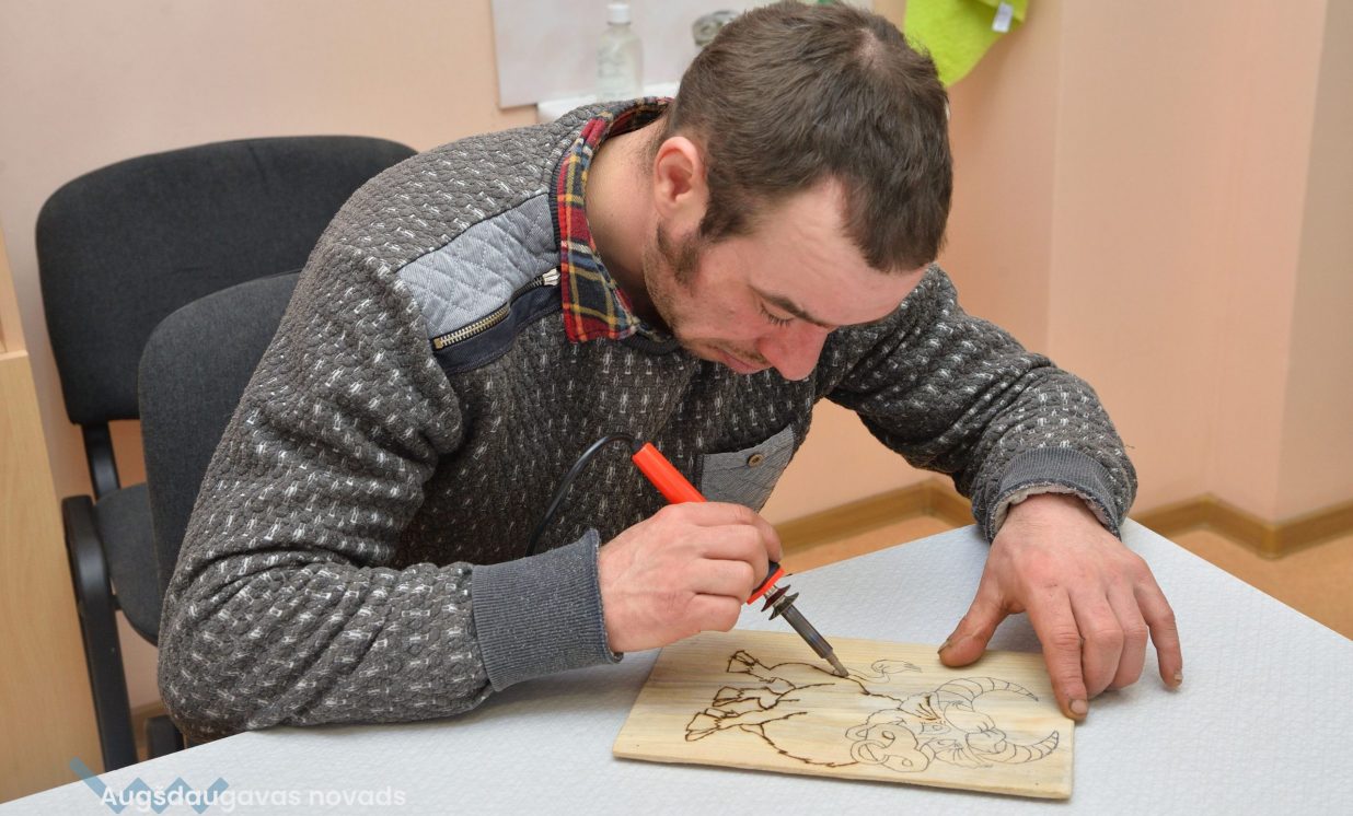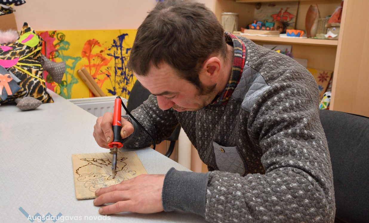 Katrs klients te atrod sirdij tīkamu nodarbi, piemēram, apgūst dažādus rokdarbus, floristikas pamatus, mācās uz koka iededzināt glezniņas. Daugavpils šūšanas uzņēmums “Klar” uzdāvinājis dienas centram šujmašīnas un regulāri nodrošina ar materiāliem šūšanas nodarbībām. No tiem top dažādi dekoratīvi spilveni un rotaļlietas. Pie šīs nodarbes sastopam Arnoldu, kurš tobrīd uzsācis šūt košu pūces veida spilvenu. Viņa dzīvesbiedre Zinaīda, ar kuru Arnolds iepazinies tepat centrā, iegrimusi floristikas darbos un veido skaistas atklātnītes. Nikolajs uz koka dēlīša iededzina 2021. gada simbolu – Vērsi, bet Jūlija labprāt rosās virtuvē, apgūstot jaunas ēdienu receptes.