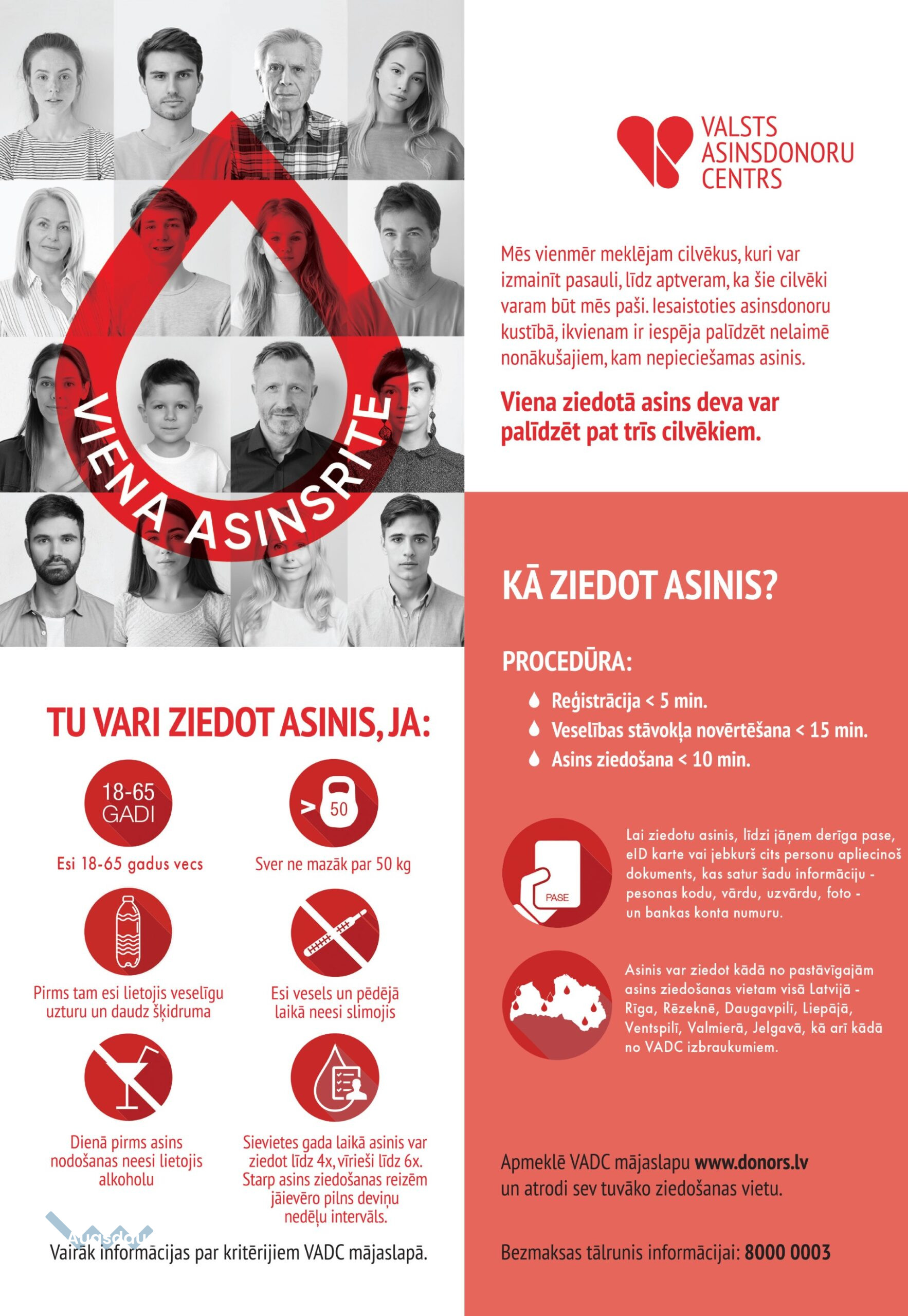 Valsts asinsdonoru centrs rīko Asins donoru dienu 31. martā no plkst. 9.00 līdz 12.00 Dubnas kultūras namā, Nākotnes ielā 1A, Augšdaugavas novadā.