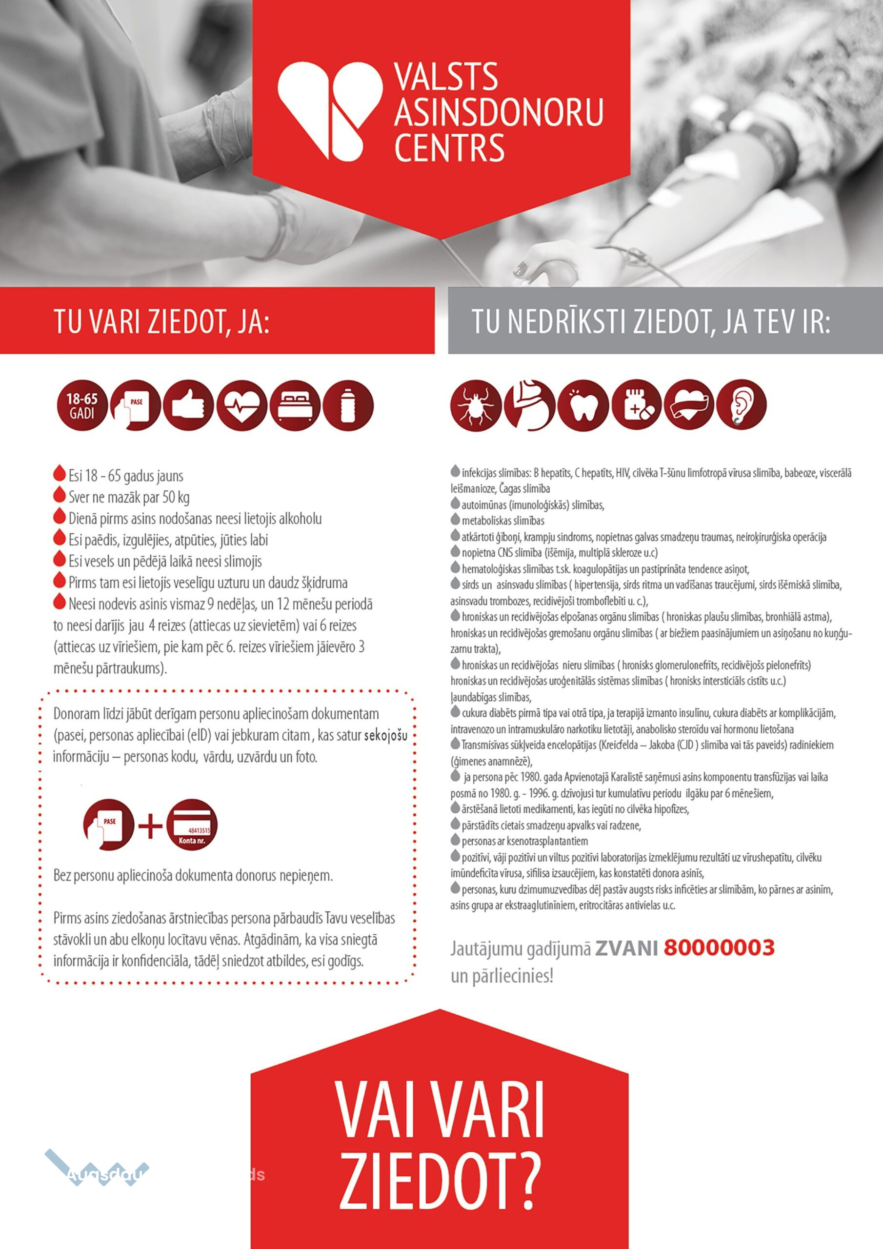 Esi 18 - 65 gadus jauns (donori, kuri asins/asins komponentus nodod pirmo reizi līdz 60 gadiem);
