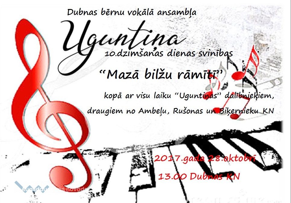 28.oktobrī plkst. 13.00 Dubnas Kultūras namā notiks Dubnas bērnu vokālā ansambļa 10.dzimšanas dienas svinības “Mazā bilžu rāmītī” kopā ar visu laiku “Uguntiņas” dalībniekiem, draugiem no Ambeļu, Rušonas un Biķernieku KN. Dubnas bērnu vokālais ansamblis aicina savus bijušos, tagadējos un nākamos dalībniekus un ciemiņus iedegt 10.jubilejas svecīti svētku kliņģerī, kopā uzdziedāt, satikt savus draugus un gremdēties atmiņās.