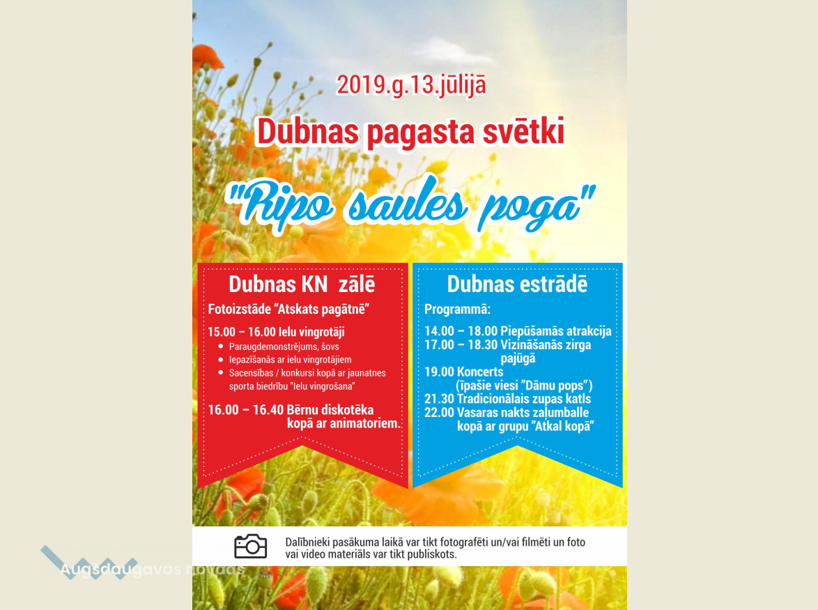 Dubnas pagasta svētki “Ripo saules poga”04.07.2019AKTUĀLI 13. jūlijā notiks Dubnas pagasta svētki "Ripo saules poga".