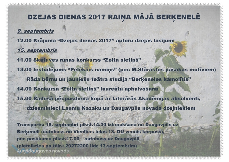 Transports: 15.septembrī plkst.14.30 izbraukšana no Daugavpils uz Berķeneli (autobuss no Vienības ielas 13, DU vecais korpuss), pēc pasākuma plkst.17.00 – autobuss uz Daugavpili (pieteikties pa tālr.: 29272200 līdz 13.septembrim).