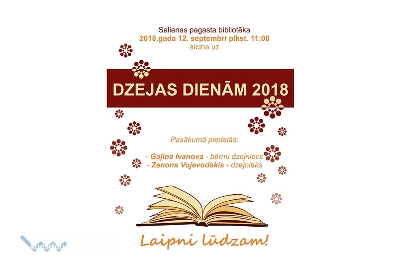 Dzejas dienas 2018 Salienā06.09.2018Kultūra 12. septembrī plkst. 11:00 Salienas pagasta bibliotēkā notiks Dzejas dienām veltīts pasākums. Pasākumā piedalās bērnu dzejniece Gaļina Ivanova un dzejnieks Zenons Vojevodskis.