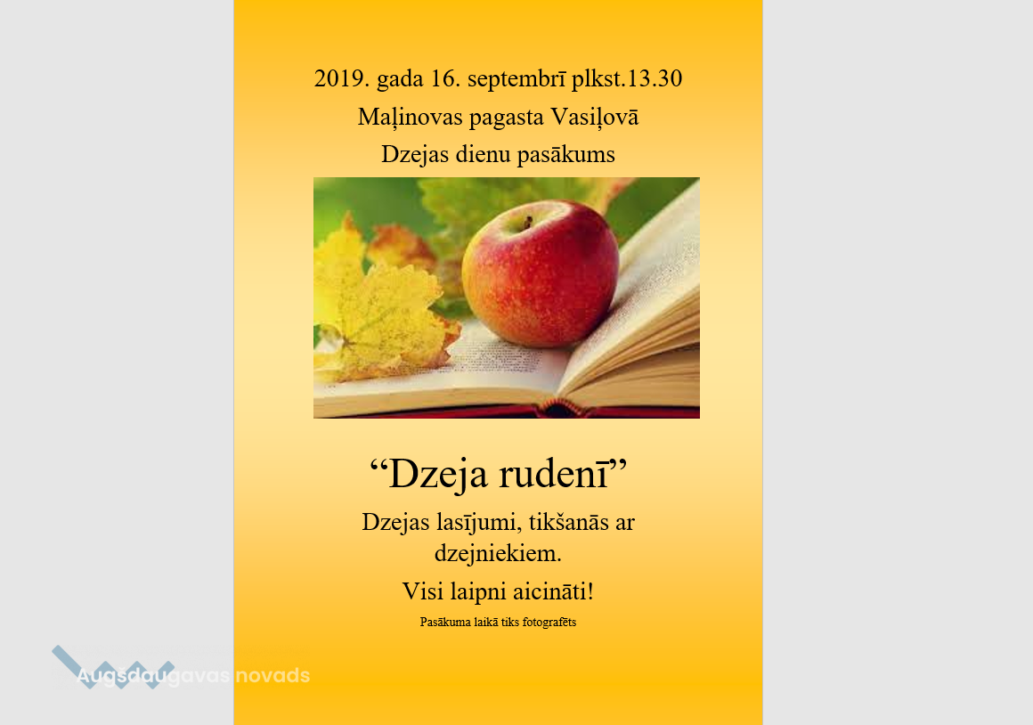 Dzejas dienas Vasiļovā10.09.2019AKTUĀLI 16. septembrī plkst. 13.30 visi laipni aicināti uz dzejas dienu pasākumu Maļinovas pagasta Vasiļovā. Baudīsim dzejas burvību un dzejas lasījumus autoru izpildījumā.