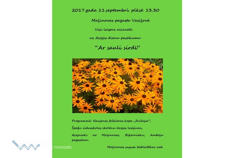 Dzejas dienas Vasiļovā05.09.2017AKTUĀLI 11. septembrī plkst.13.30 Maļinovas pagasta Vasiļovā pie Raiņa piemiņas akmens notiks Dzejas dienām veltīts pasākums. Laipni aicināti visi dzejas mīļotāji!