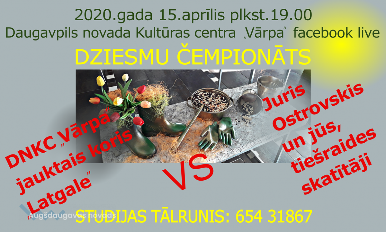Laikā, kad daudzi strādājam attālināti un internetvide ir kļuvusi par mūsu tikšanās vietu, aicinām šodien pieslēgties Daugavpils novada Kultūras centra "Vārpa" sociālā tīkla facebook profilam un būt kopā ar mūsu novada jaukto kori "Latgale" un dziedātāju Juri Ostrovski.
