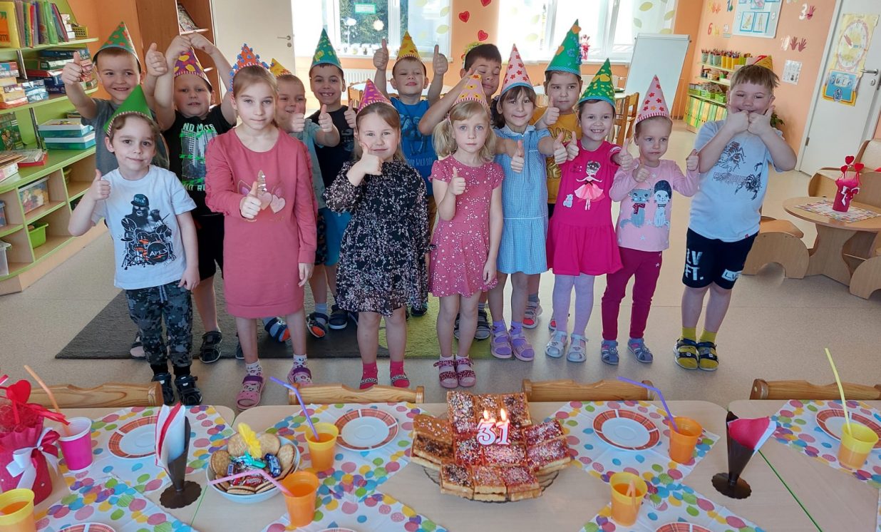 Visu februāri bērni gatavojas iestādes dzimšanas dienai. Šogad mēs svinējām 31.gadu. Bērni pētīja skaitli 31, gatavoja dzimšanas dienas cepurītes, apsveikuma plakātus. Bērni no grupas “Rūķīši”, “Bitītes”, “Pienenītes”, “Zivtiņas” piedalījās zibakcijā par godu iestādes Dzimšanas dienai tišsaitē, tas bija ļoti interesanti un mēs guvām jaunu pieredzi. Izrādījās, ka dejot lielā pulkā vienmēr ir jautrāk! Kādi svētki mēdz būt bez svētku cienasta? Katrā grupā tapa savs konditorejas izstrādājumu šedevrs! Svētki izdodas!