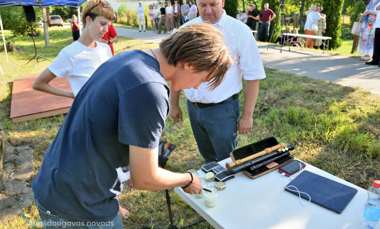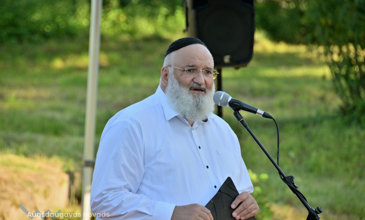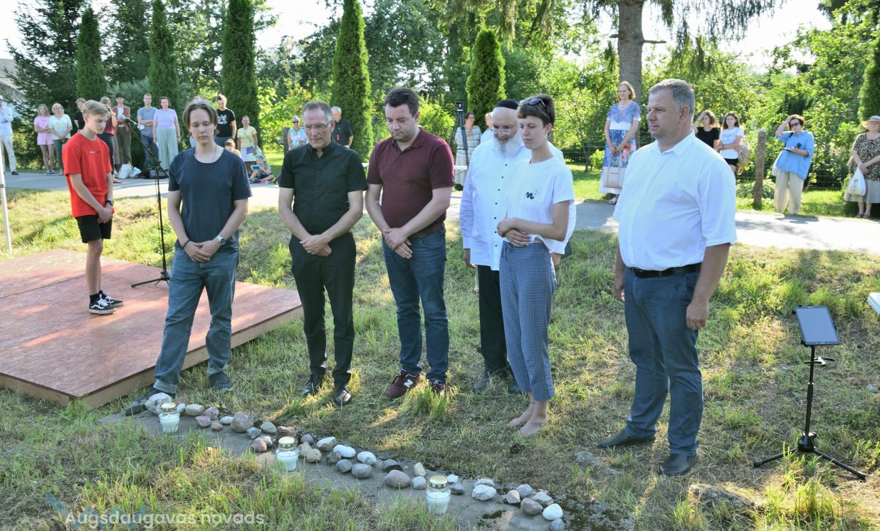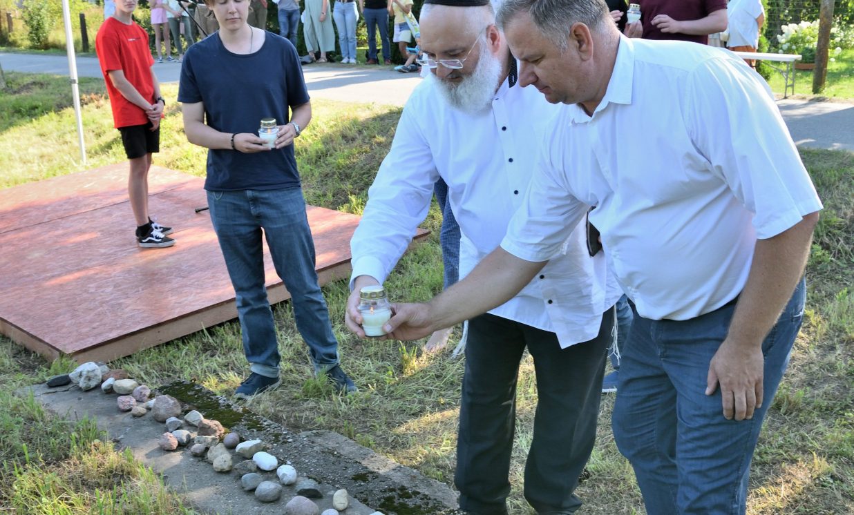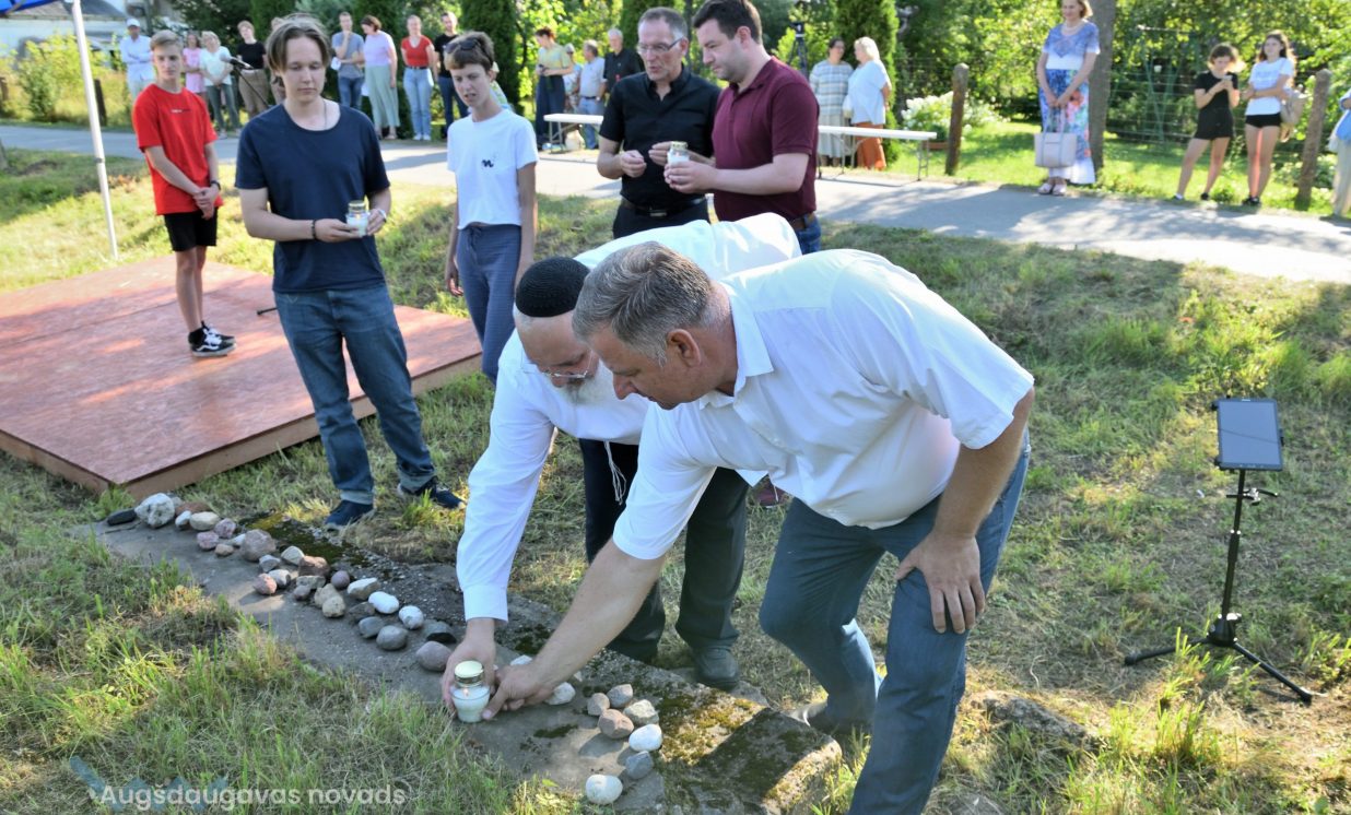 Višķu pagasta pārvaldes vadītājs Jānis Proms kopā ar Baruhu Čauskinu, Vācijas pārstāvjiem un jauniešiem nolika piemiņas sveci pie bijušās sinagogas pamatiem.