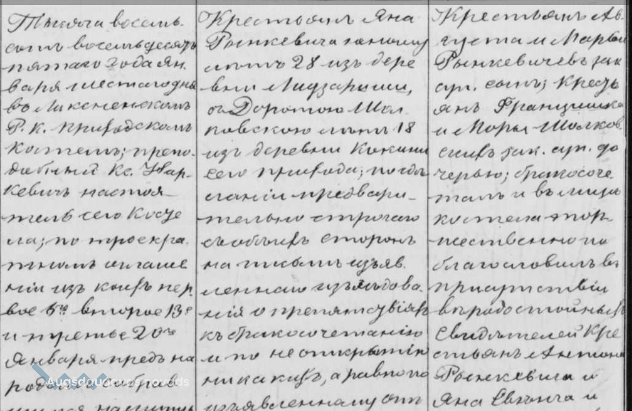 Jānis un Dorota laulāti 1885. gada 6. janvārī Līksnas katoļu draudzē. Zemnieks Jānis laulību brīdī bija 28 gadus vecs, Dorota Šalkovska 18 gadus veca. Līgavaiņa vecāki: Augusts un Marianna Rinkeviči. Līgavas vecāki: Francišks un Mora Šalkovski.