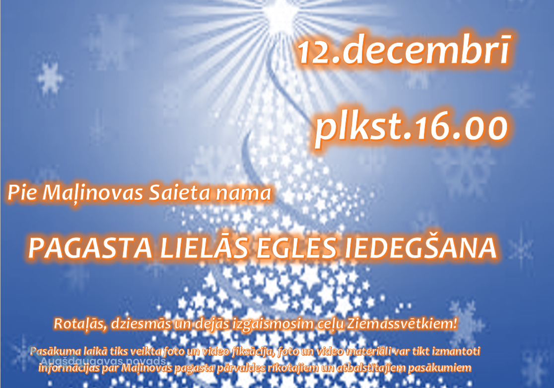 Maļinovas pagasta Saieta nams 12. decembrī plkst. 16.00 aicina lielus un mazus uz pagasta Lielās Ziemassvētku egles iedegšanas pasākumu! Nāciet, lai rotaļās, dziesmās un dejās izgaismotu ceļu Ziemassvētkiem! Pēc pasākuma pagasta autotransports nodrošinās iedzīvotāju nogādāšanu mājās.