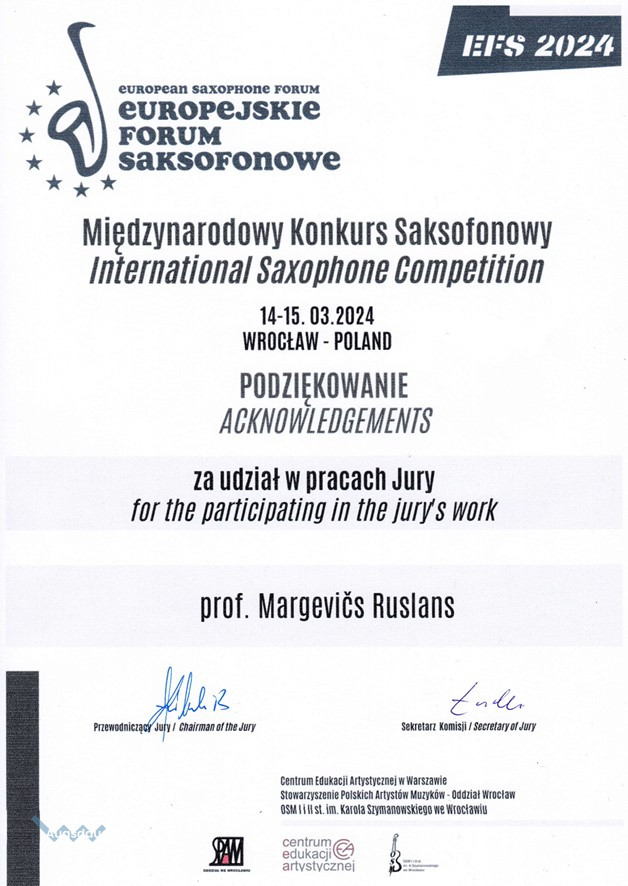 No 14. - 16. martam Vroclavā (Polija) notika Eiropas Saksofonu forums, kuru organizēja Vroclava K. Lipinska Mūzikas akadēmija, sadarbībā ar Poļu Mūzikas asociāciju. Foruma ietvaros notika meistarklases, lekcijas, koncerti un 14.-15. martā Starptautiskais Saksofonistu konkurss, kurā piedalījās jaunie izpildītāji no Polijas, Itālijas, Grieķijas, Latvijas, Ungārijas, Ukrainas, Austrijas un Izraēlas.