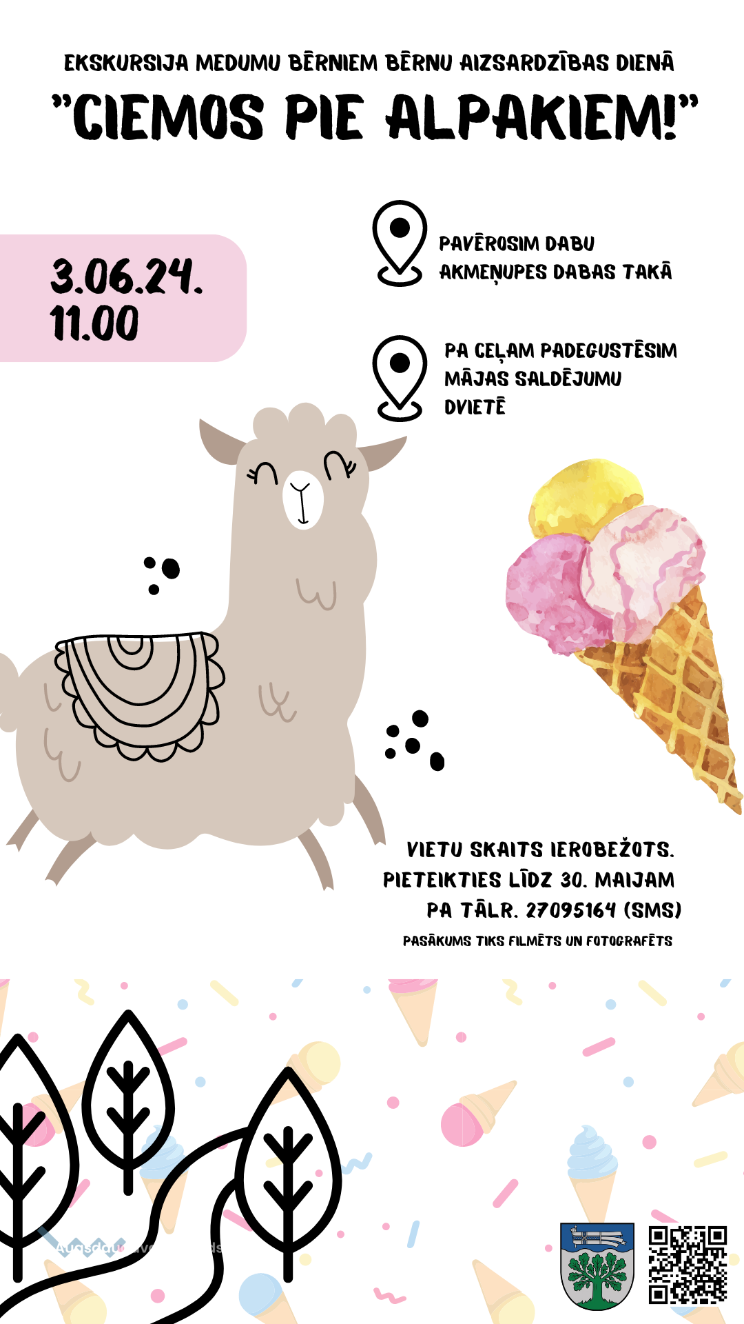 Bērnu aizsardzības dienu svinēsim aizraujošā ekskursijā “Ciemos pie Alpakiem!”. Aicinām Medumu bērnus pieteikties ekskursijai, kura notiks 3. jūnijā! Vērosim dabu Akmeņupes dabas takā, pa ceļam degustēsim mājas saldējumu Dvietē. Pieteikties līdz 30. maijam pa tālr. 27095164 (sms), vietu skaits ierobežots.
