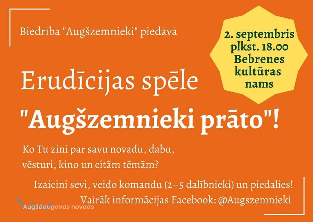 2. septembrī Bebrene jau otrās Augšzemes erudīcijas spēle, ko piedāvā biedrība Augšzemnieki. Laipni aicināti gan novadnieki, gan viesi!