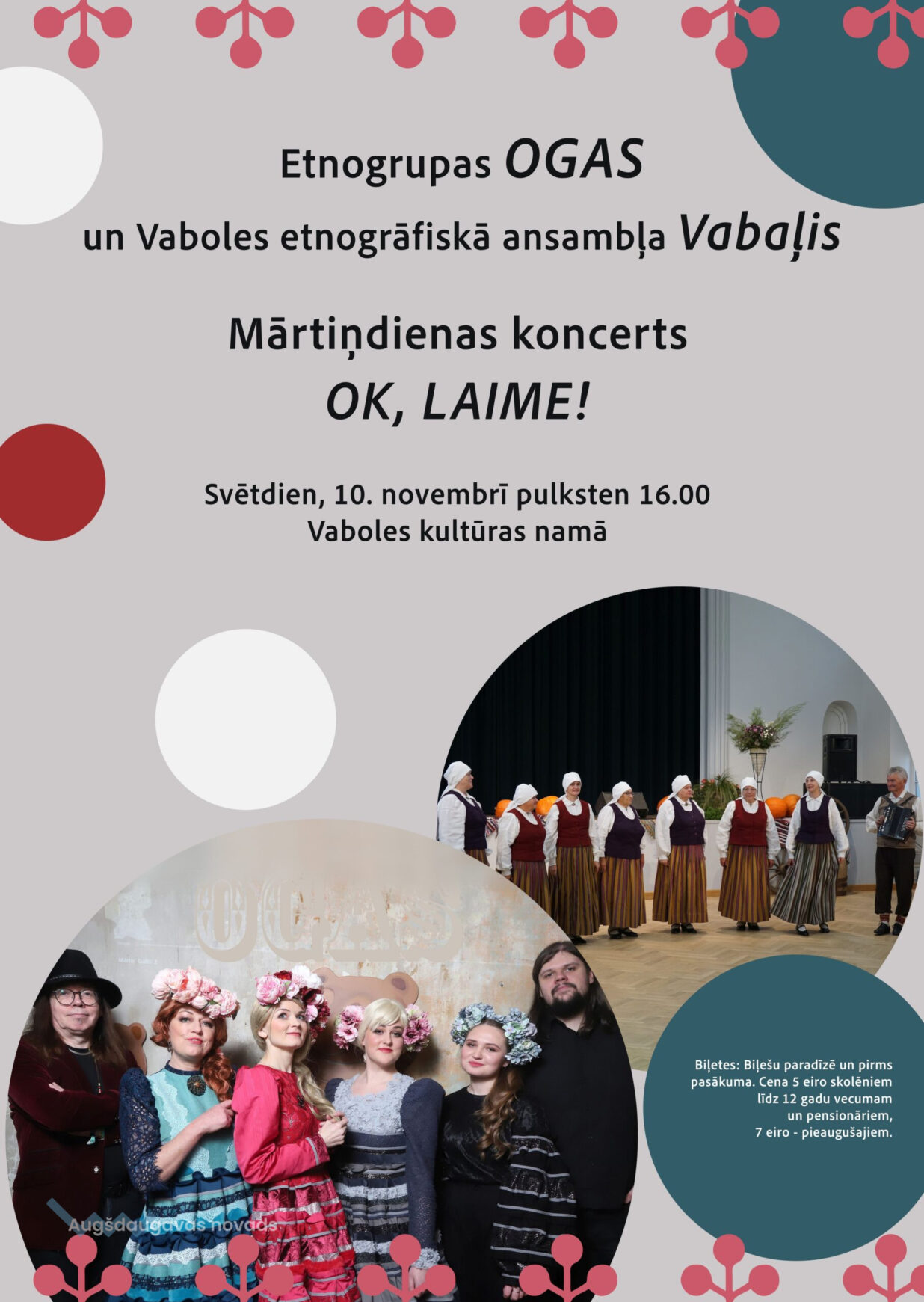 Svētdien, 10. novembrī, pulksten 16.00 Vaboles kultūras namā notiks tautas mūzikas koncerts, kurā uzstāsies Vaboles etnogrāfiskais ansamblis “Vabaļis” un etnogrupa “OGAS” no Rīgas.