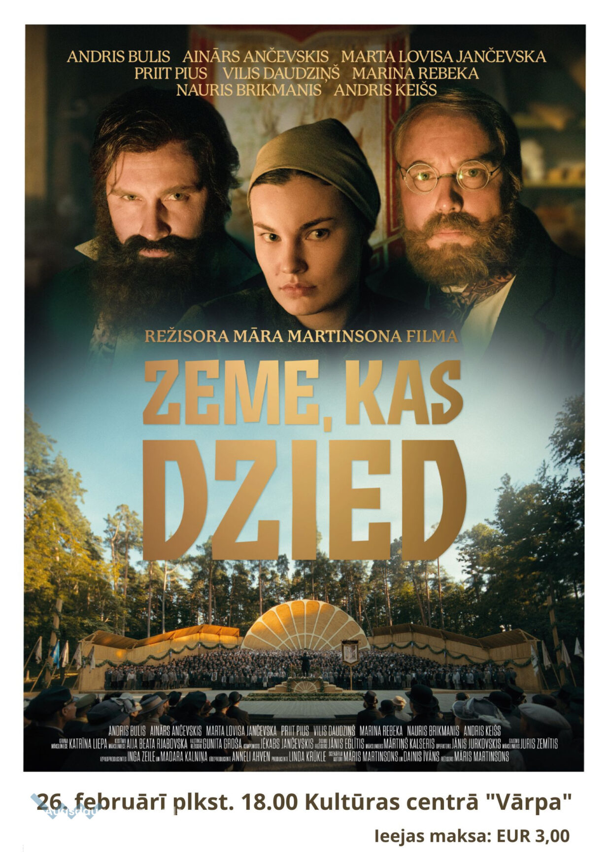 26. februārī plkst. 18.00 Augšdaugavas novada kultūras centrā “Vārpa” būs skatāma filma “Zeme, kas dzied”. Spēlfilmas pamatā ir stāsts par Pirmo latviešu dziedāšanas svētku dzimšanu un uzņēmīgajiem cilvēkiem, kas aizsāka šo unikālo, no paaudzes paaudzē nododamo mantojumu.