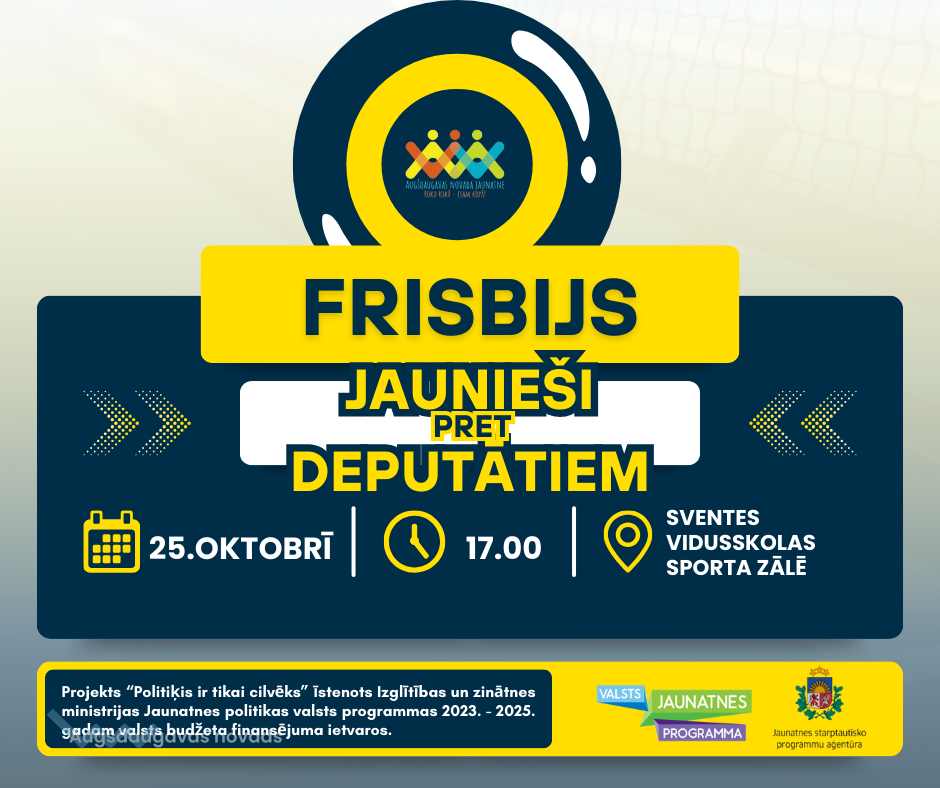 Aicinām komandas uz noslēdzošo neformālo tikšanos projekta "Politiķis ir tikai cilvēks" ietvaros. Šoreiz spēlēsim frisbiju Sventes vidusskolas sporta zālē 25.oktobrī plkst.17.00. Aicinām komandas pieteikties līdz 23.oktobrim plkst. 12.00 sūtot komandas pieteikumu uz milana.loca@augsdaugavasnovads.lv ar komandas nosaukumu, dalībnieku skaitu un atbildīgās personas (komandas kapteiņa) kontaktiem.