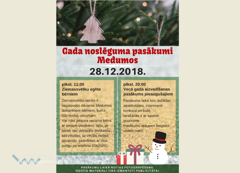 Aicinām apmeklēt gada noslēguma pasākumus Medumu pagasta Tautas nama zālē, kuri notiks š.g. 28. decembrī.
