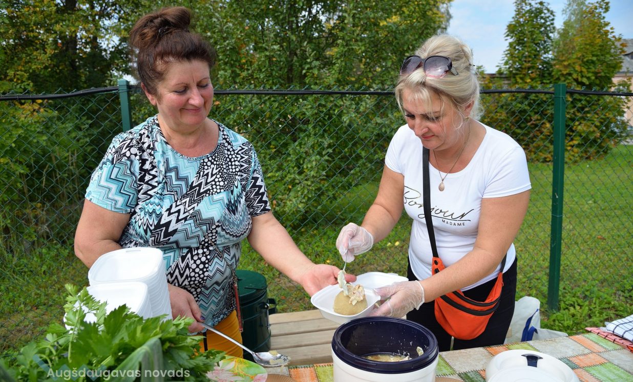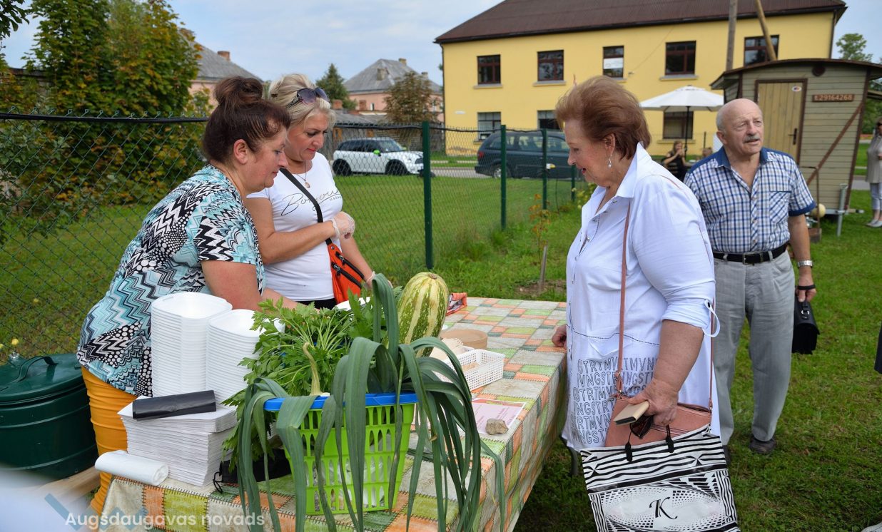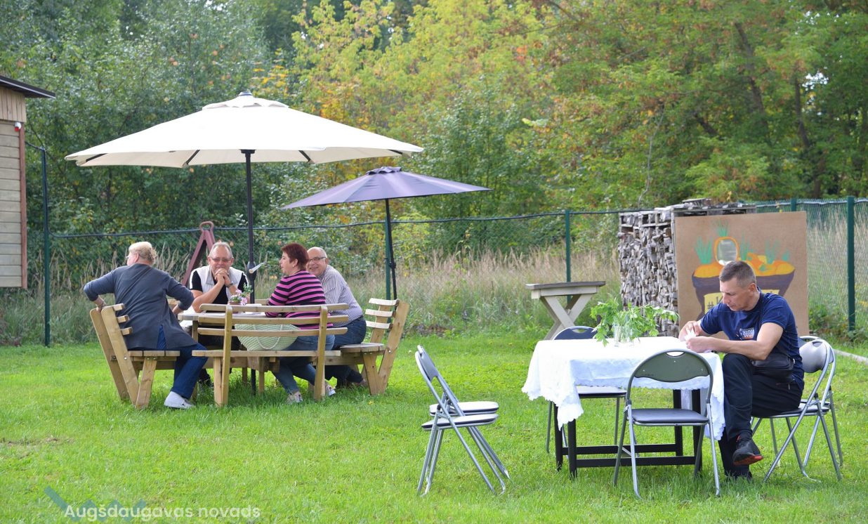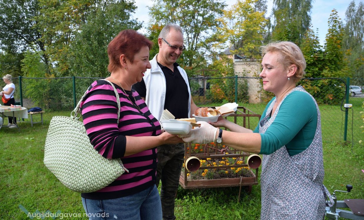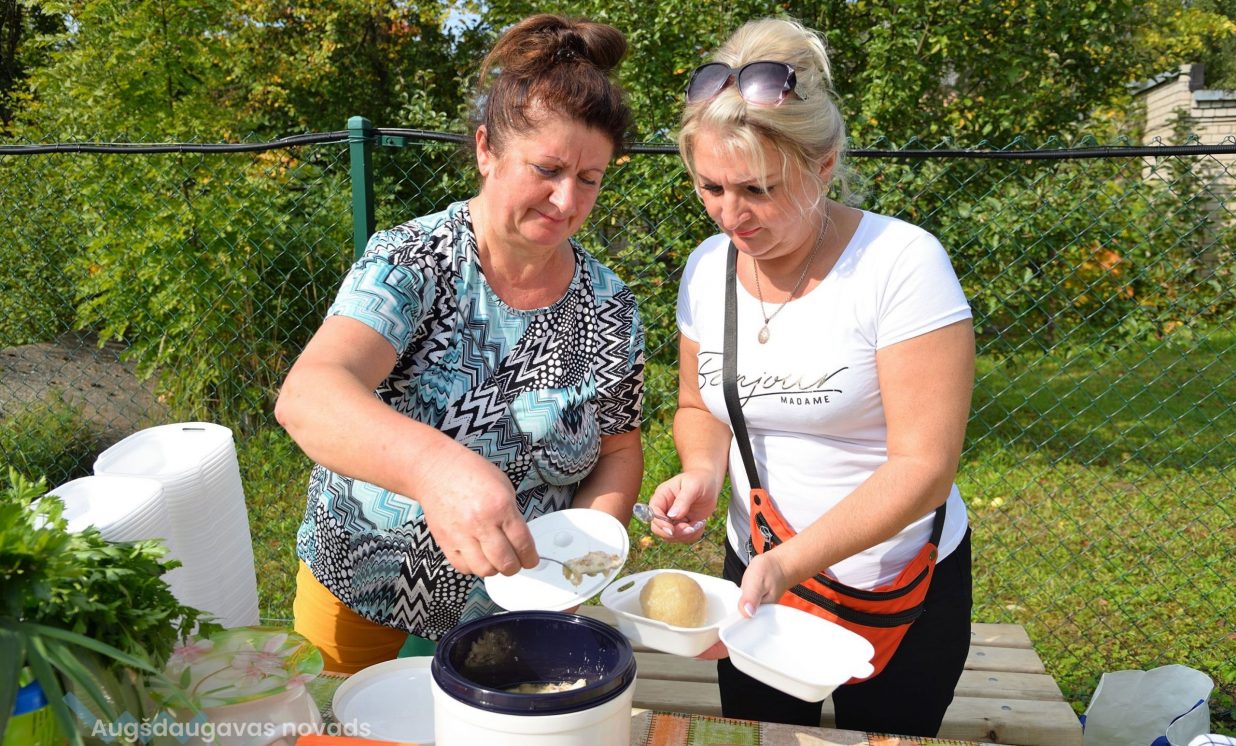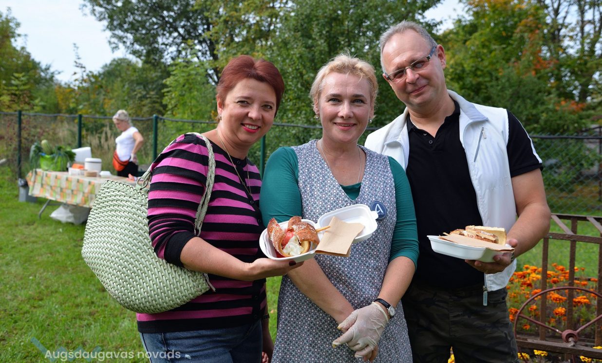 11. septembrī atpūtas vietā AugustplatzKalkūnos jau otru reizi notika īsta balle gardēžiem. Pasākuma “Mājas kafejnīcu dienas” apmeklētāji tika laipni aicināti nobaudīt dažādus vietējos labumus, ko gatavo visīstākie kulinārā mantojuma tradīciju nesēji – vietējie iedzīvotāji. Galdā tika celti mājas ēdienu, gatavoti pēc sen pārbaudītām tradicionālām latviešu, latgaliešu, lietuviešu, krievu un pat turku receptēm. Šoreiz pasākumā piedalījās arī vietējie amatu meistari, kas izgatavo dažādas praktiskas un skaistas lietas. Viesus priecēja arī vēsturisko deju kolektīvs no Tabores. Šoreiz pasākums bija veltīts medību tēmai, jo 19.gs beigās Kalkūnu muižas īpašnieks Augusts fon Etingens bija baltvācietis, kam visvairāk dzīvē patika medīt savos plašajos medību laukos kopā ar Otto fon Bismarku. Pēc medībām draugi pavadīja laiku pie smalki uzklāta galda, vērojot galma dejas. Galdā tika celta saimnieces Jolantas Bāras gatavotā stirnas gaļas zupa ar kirbju bekona mēnestiņu Etingēna gaumē, ķirbju podiņi ar meža sēnēm, rupjmaizes kārtojums un zāļu tēja, kā arī dažādi konservējumi ziemai un pat sīpolu zapte. Saimniece Svetlana Smirnova gatavoja savu tradicionālo našķi – skursteņkukūkas, ko varēja nobaudīt ar plūmju ievārījumu un saldējumu. Kalkūniete Marija Kuhanoviča bija sarūpējusi gardus cepelīnus. Šī ēdiena recepti viņa aizguvusi no savas māmuļas, kas bija lietuviete. Marijas mājās cepelīni tiek gatavoti ļoti bieži īstā lauku krāsnī. Lai arī cepelīnu gatavošanas process ir visai laikietilpīgs, saimniecei tas sagādājot īstu baudu. Svētkiem viņa bija sagatavojusi 40 cepelīnus, ko pasniedza ar gardu gaļas un sīpolu mērci. Viņai talkā nāca Aļona Kovaļkova. Vineta Era ar savu vīru – turku Aitaku (Aytac) uz ugunskura vārīja kazas gaļas un sīpolu zupu turku gaumē, gatavoja turku pankūkas, ķirbju saldumus un picu “pide”. Šoreiz apmeklētāji varēja iegādāties arī vietējo amatnieču darinājumus. Jeļena Gridasova piedāvāja dažādus praktiskus tamborējumus – somas, kosmētikas maciņus, lādītes un traukus dažādu mantu glabāšanai. Ar rokdarbiem aizrāvies arī viņas dēls Vladimirs, kurš veido dažādas pītas figūriņas. Rokdarbniece Jeļena Poltarjonoka darina dažādus praktiskus sīkumus no koka, ko pati arī apglezno, -- atslēgu piekariņus, magnētiņus, olu turētājus un rotaļlietas. Amatniece atzīst, ka iedvesmu smeļas no saviem bērniem un viņu mīļākajiem animācijas filmu varoņiem. Goda vietā šoreiz bija arī sīpoli, kas ir neatņemama visu ēdienu sastāvdaļa. Pasākumā neiztika bez stāstiem par ēdienu vēsturi un sīpoliem. Jolanta Bāra zina stāstīt pat īpašo pasaku par Kalkūnu sīpoliem. “Reiz senos laikos kāds nabaga vīrs no Baltkāju kalna apkārtnes brauca uz Daugavpils tirgu pārdot vezumu lielu un gardu sīpolu, kādus mācēja izaudzēt tikai viņa sieva. Visu vasaru saime bija stādījusi, laistījusi un ravējusi, un tagad Daugavpils traktieros esot daudz ciemiņu, kam galdā jāceļ gardi sīpolu klopši, pīrāgi un zupas – sīpoliem laba cena un to daudz vajagot. Rītausmas vēsumā vecā un lēnīgā ķēvīte vēl tīri mundri klidzināja cauri Kalkūnu ciemam, un vīrs domāja jaukas domas par to, ka nopelnīs labu naudiņu, nopirks lietas saimniecībai – kādas naglas un ķieģeļus, ķipjus un spaiņus, gardumus bērniem, ko skaistu sievai, un vēl, vēl…vecākā meita jālaiž skolās un jāpērk kāds vēršādas gabals apaviem, vajag sāls maišeli speķa sālīšanai, un varbūt paliks kāds grasis kortelītim uz apkūlībām. Te piepeši straujajā ceļa līkumā uz kalna, kur joprojām stāv Kalkūnes muižas pils, no pils vārtiem uz ceļa izbrāzās četrjūga kariete. Muižas kunga viesi devās mājup uz Rīgu, un trakulīgie zirgi, muižas lepnajā stallī labi pabaroti un nostāvējušies, nebija vairs viegli valdāmi. Zemnieka ķēvīte no pārsteiguma paklupa, rati uz kalna sagriezās un apgāzās. Visa sīpolu krava pašķīda un aizripoja no kalna lejā, kurš ieripoja zem žoga pagalmā, kurš tīrumā, kurš pie mājas pakša. Kalkūnu ciema saimnieces, priecīgas par negaidīto veiksmi, veikli salasīja slavenos, gardos sīpolus un noslēpa sēklai – ciema auglīgajā, mālainajā zemē labi padevās dārzeņi, bet pavisam labu sīpolu gan te vēl nebija bijis. Zemnieks apsēdās ceļa malā un sāka raudāt – kā lai tagad atgriežas mājā, pavisam tukšām rokām? Bet kalkūnieši, kā ieraduši dzīvot draudzīgi, drīz vien sāka nākt ar savām veltēm, un sanesa vīram pilnu vezumu Kalkūnos taisītu labumu – ķieģeļus, naglas, traukus, sāli, ādas gabalu, gardumiem kaltētus ābolus un bumbierus, krāsainus lakatiņus un zeķes, un par spirta brūzī taisītu kortelīti arī neaizmirsa. Brauca vīrs mājup priecīgs, bet Kalkūnos joprojām audzē un ēd sīpolus, paaudzēs glabājot receptes. Tā runā, ka franču sīpolu zupu un sīpolu marmelādi te iemācījušies gatavot kopš laikiem, kad te stāvējis franču karaspēks, bet vācu sīpolkūka, poļu sīpolu pīrāgi, lietuviešu cepelīni ar sīpolu mērci un daudzi citi sīpolu ēdieni ir tradicionāli daudzajām tautībām, kas izsenis kopā draudzīgi dzīvo Kalkūnos. Un, ja kāds ciemiņš kalkūniešiem dikti iepatīkas, tad tāds var cerēt saņemt dāvanā ģimenes sīpolu sēklai no vietējām saimniecēm. Teksts, foto: Inese Minova