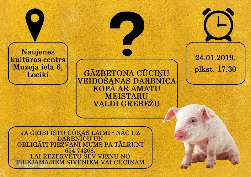 Īsi un konkrēti – ja cūkas gadā gribi īstu cūkas laimi, nāc uz darbnīcu! 24. janvārī plkst. 17.30, Naujenes kultūras centrā (Muzeja iela 6, Lociki) amatu meistara Valda Grebeža vadībā veidosim foršus rukšus par godu jaunajam gadam!