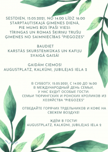 15. maijā no plkst. 14.00 līdz 16.00 Starptautiskajā ģimenes dienā, atpūtas laukumā Augustplatz Kalkūnē viesosies īpašie viesi-Tīringas un Romas šķirņu trušu ģimenes no saimniecības “Piegozes”.