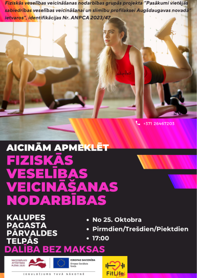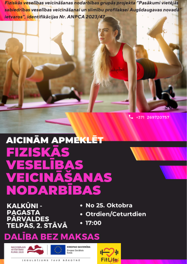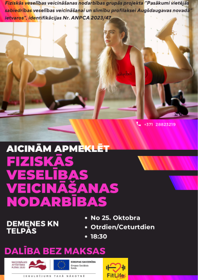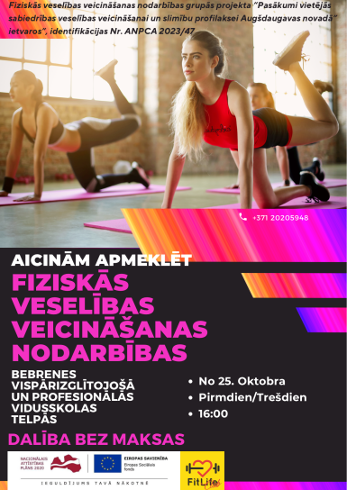 Īstenojot ESF projektu “Pasākumi vietējās sabiedrības veselības veicināšanai un slimību profilaksei Augšdaugavas novadā " (Nr. 9.2.4.2/16/I/070), Augšdaugavas novada pašvaldības centrālā administrācija aicina pieteikties bezmaksas fizisko aktivitāšu nodarbībām.