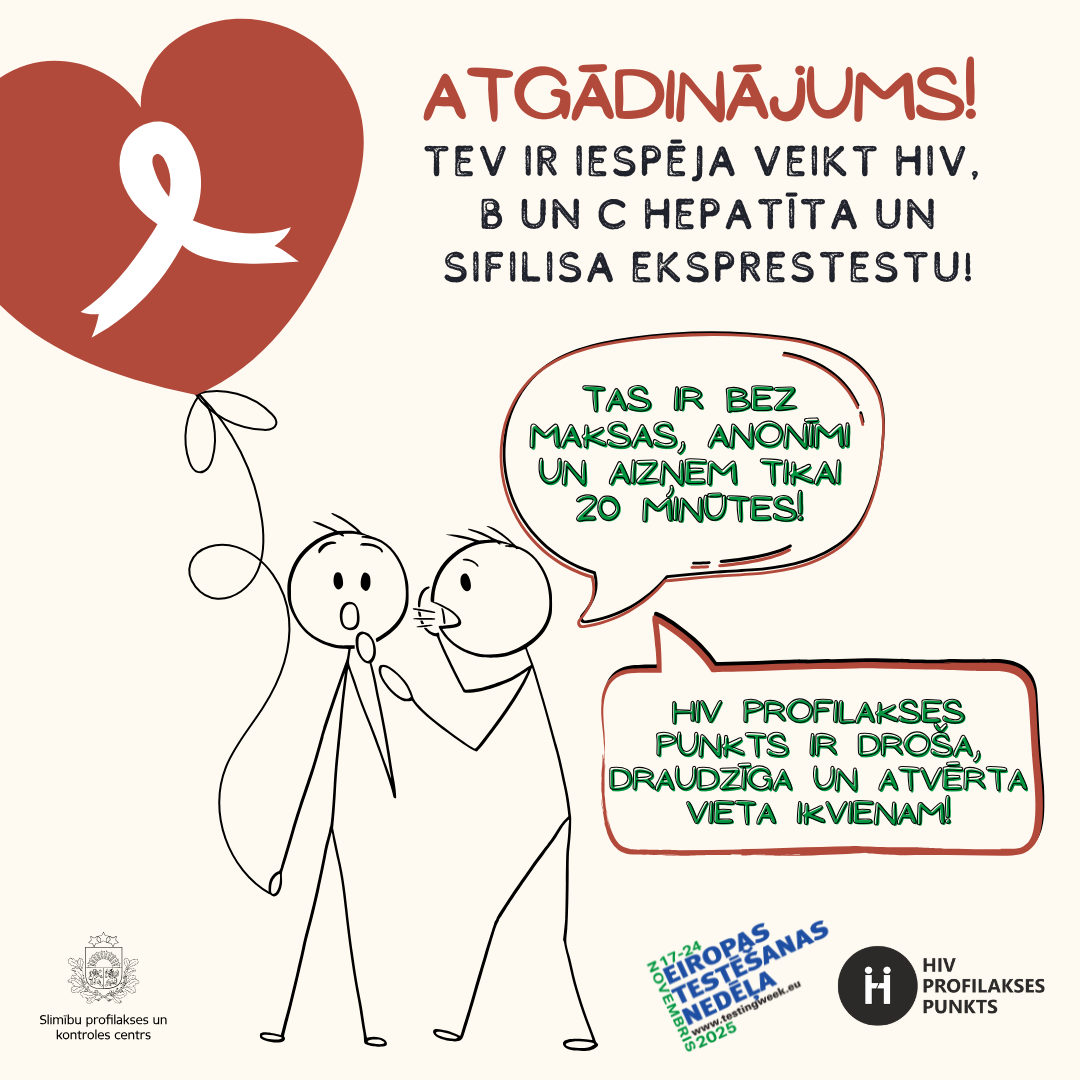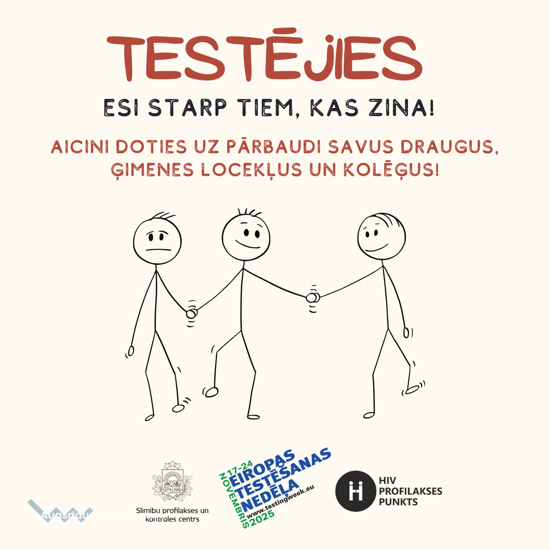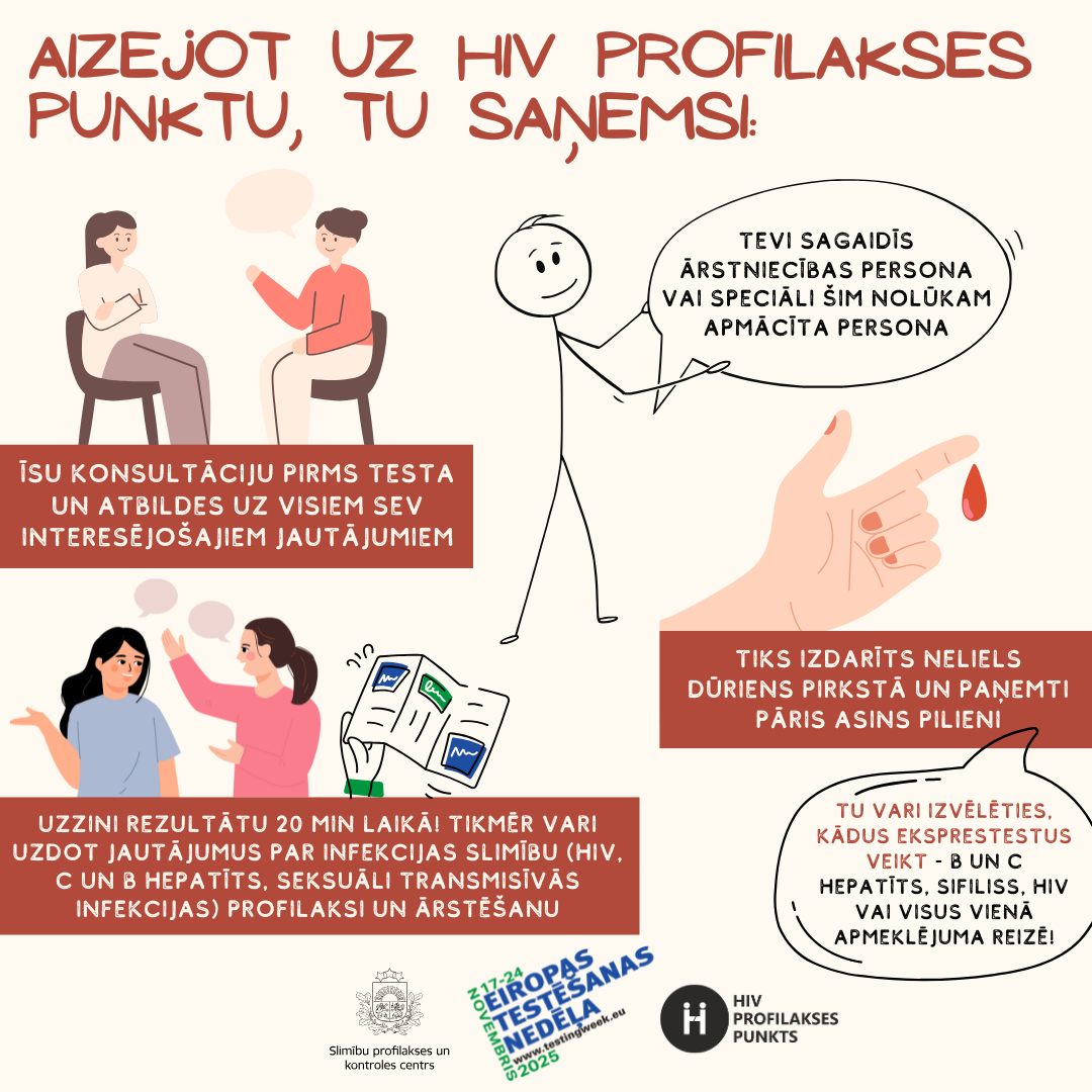 No 19. līdz 25. novembrim HIV profilakses punkti visā Latvijā iesaistīsies Eiropas rudens testēšanas nedēļas aktivitātēs. Šajā laikā iedzīvotāji tiek aicināti pārbaudīt savu veselību, veicot HIV, B un C hepatīta, kā arī sifilisa eksprestestu.