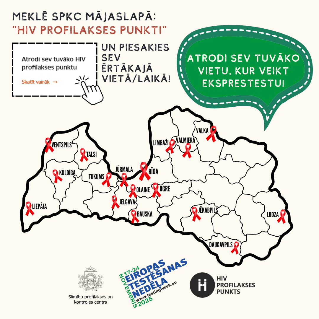 Lai iedzīvotāji vieglāk atrastu sev ērtāko vietu un laiku testēšanai, izveidots bezmaksas aktivitāšu kalendārs, kurā vienuviet apkopotas HIV profilakses punktu un izbraukuma testēšanas norises vietas un datumi visā Latvijā. Plašāka informācija par testu veikšanas punktiem un to darba laikiem atrodama šeit: https://www.spkc.gov.lv/lv/hiv-profilakses-punkti