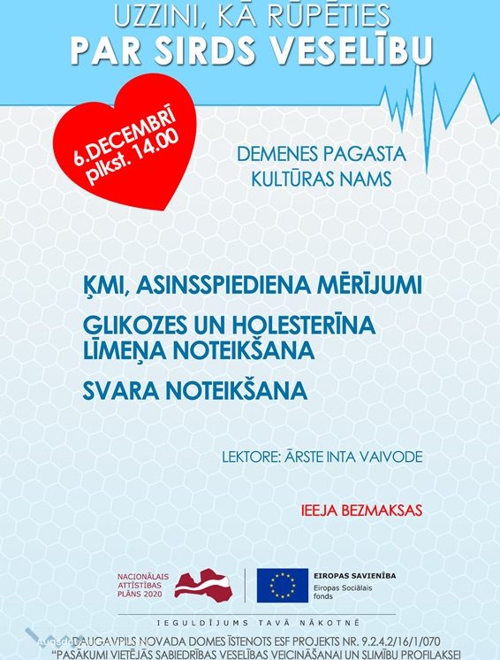 1.decembrī Medumu pagastā notika psihiskās un garīgās veselības profilakses pasākumi, savukārt 6. un 14. decembrī notiks sirds un asinsvadu slimību profilakses pasākumi. Tie, kas apmeklēs šos pasākumus, varēs praktiski izmērīt asinsspiedienu, veikt glikozes un holesterīna, kā arī svara noteikšanas mērījumus un izrēķināt ķermeņa masas indeksu. Uz vietas varēs konsultēties ar ārstu par savas sirds un asinsvadu veselību. Jāsaka, ka projekta aktivitātēs var iesaistīties ikviens novada iedzīvotājs. Lai veicinātu un popularizētu veselīgu dzīvesveidu, tad pasākumu laikā klātesošajiem tiek piedāvāta arī veselīgo uzkožu pauzes.