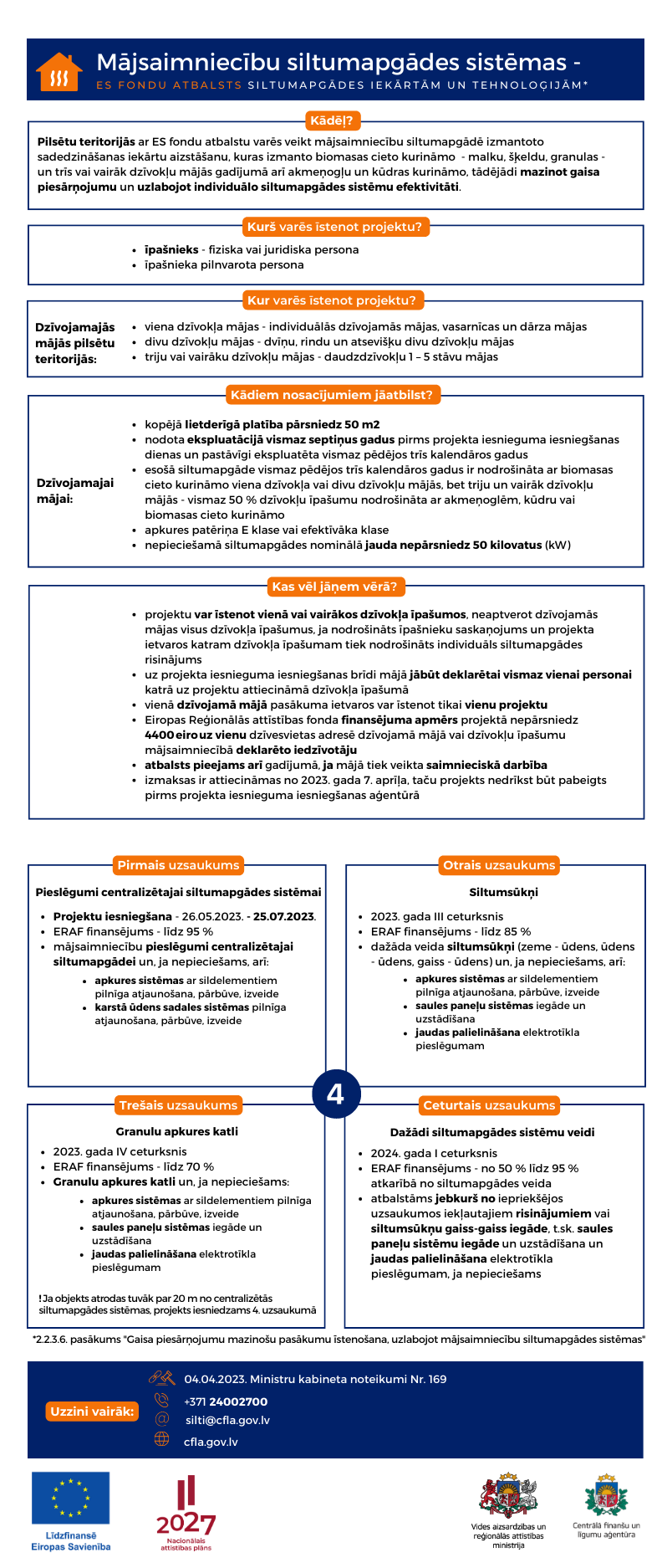 Pasākuma mērķis ir samazināt gaisa piesārņojuma radīto negatīvo ietekmi uz vidi un cilvēku veselību, aizstājot mājsaimniecību sektora dzīvojamās mājās siltumapgādē izmantotās sadedzināšanas iekārtas, uzlabojot individuālo siltumapgādes sistēmu efektivitāti, ieviešot siltumapgādes iekārtas un tehnoloģijas, kas būtiski samazina gaisa piesārņojumu. Pasākuma mērķa grupa ir valstspilsētu un novadu pilsētu iedzīvotāji un mājsaimniecības. Projektu īstenošanai pieejamais finansējums otrajā uzsaukumā ir vismaz 3 529 412 euro, tai skaitā ERAF finansējums – 3 000 000 euro un privātais finansējums – vismaz 529 412 euro. Atbalsts pasākuma ietvaros tiek sniegts granta veidā. Projektu iesniegumu atlases otrā uzsaukuma projektu iesniegumu pieņemšana par dažādu veidu siltumsūkņu uzstādīšanu mājsaimniecībās notiks no 2023. gada 26. jūlija līdz 2023. gada 25. septembrim (ieskaitot). Pasākuma ietvaros projektus jāīsteno 24 mēnešu laikā, bet ne vēlāk kā līdz 2025. gada 31. decembrim. Projektu iesniegumu atlasi un līgumu slēgšanu nodrošinās CFLA.