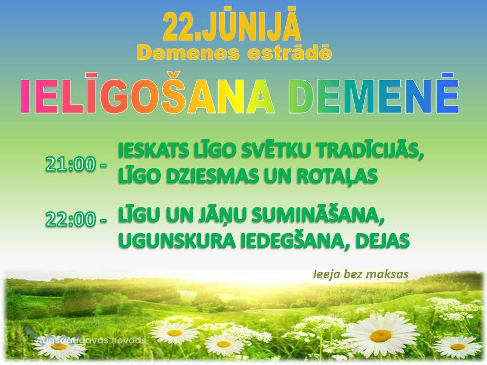 Demenes kultūras nams aicina visus uz Ielīgošanu Demenē, kas notiks 22. jūnijā plkst. 21.00 Demenes estrādē.