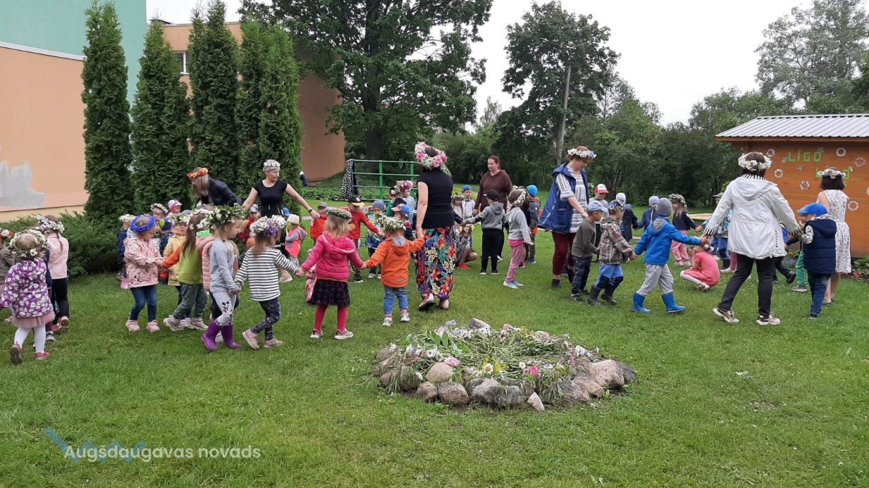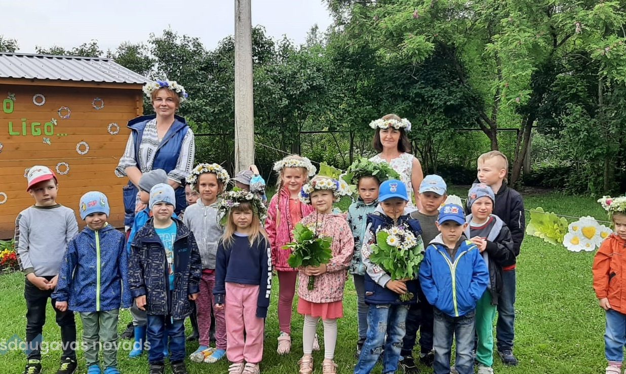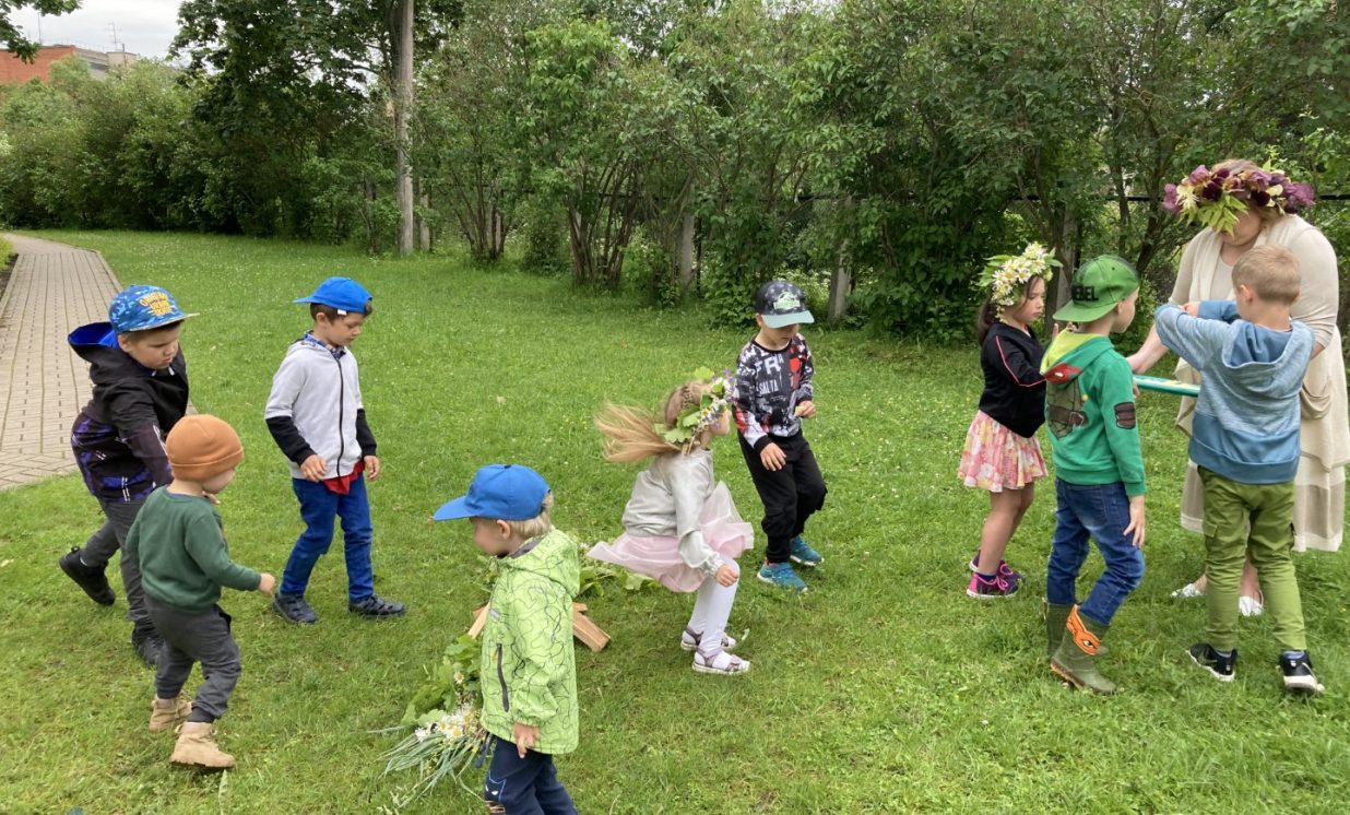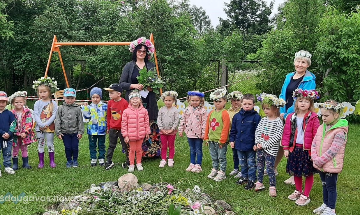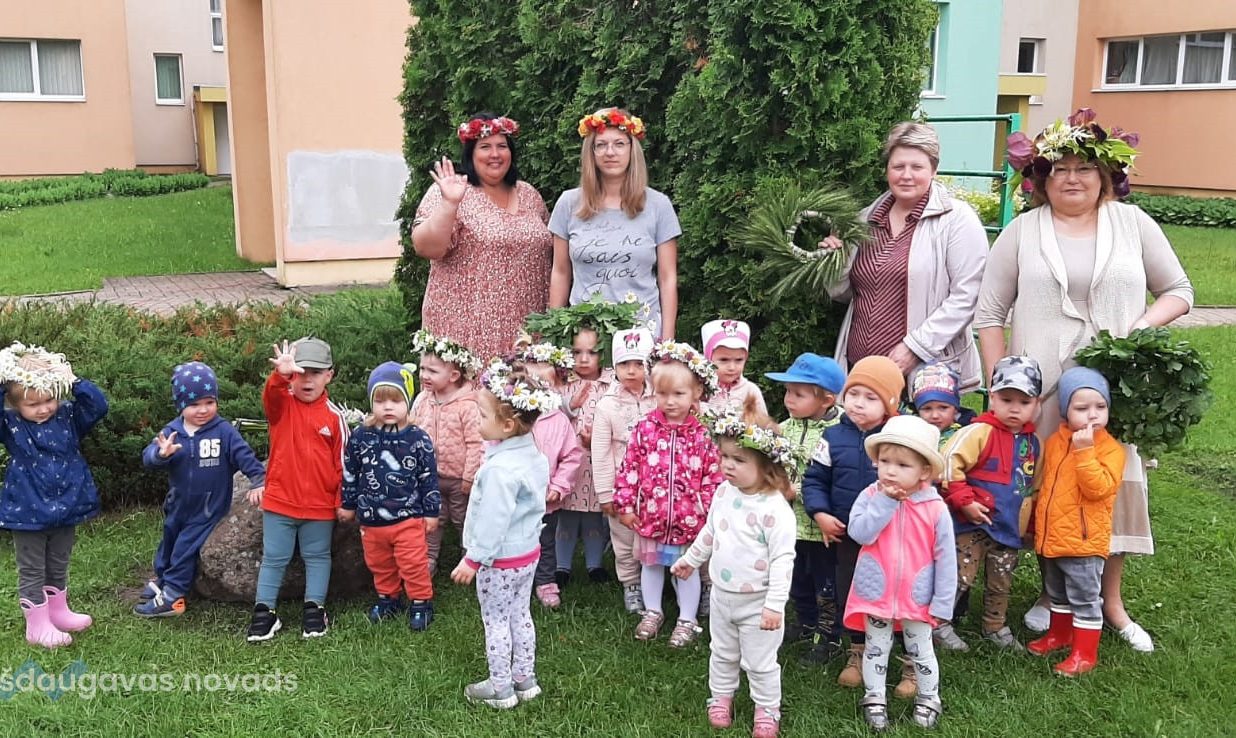 Šogad laiks īpaši mūs nelutina, bet tomēr īsi pirms vasaras Saulgriežiem, 21.jūnijā mums izdevās notvert mirkli un kārtīgi ielīgot latviskākos svētkus- Jāņus. Pirmssvētku rosība bija jūtama jau iepriekšējā nedēļā. Skolotājas palīdzēja bērniem iepazīt dažādus Līgo svētku faktus, tradicionālos ēdienus. Iepazina dažādus pļavā un dārzā augošus augus, puķes, vēroja un pētīja to atšķirīgās un kopīgās iezīmes. Bērni zīmēja, līmēja, veidoja dažādus radošus darbiņus, lielākie -mācījās pīt vainadziņus .Tika veidotas dekorācijas no pļavās salasītiem augiem un puķēm laukumu rotāšanai. Līgo vakars un Jāņi ir paši līksmākie svētki gadskārtā, tāpēc ielīgošanai jābūt lustīgai. Svētku laikā atsaucām atmiņā latviešu tautas tradīcijas, skaitījām tautas dziesmas, vienojāmies kopīgās dziesmās un rotaļās. Ar ozollapu vainadziņu suminājām mūsu Jāni - I.jaunākās grupas "Skudriņas" audzēkni. Kad visu gadu krātās dziesmas tika izdziedātas un rotaļas izspēlētas, tad lecām pāri ziedu ugunskuram un cienājāmies ar sieru . Paldies audzēkņu vecākiem par Jāņu zāļu un ziedu sagādi! Priecīgus un lustīgus vasaras saulgriežus!