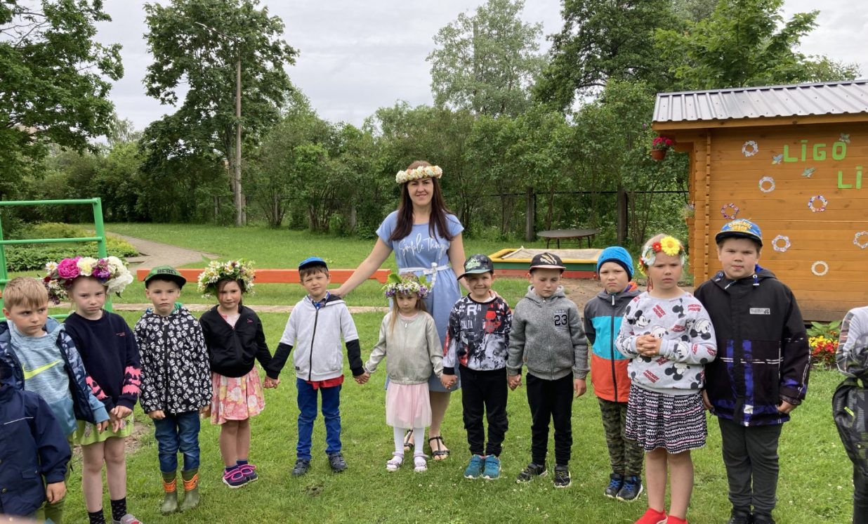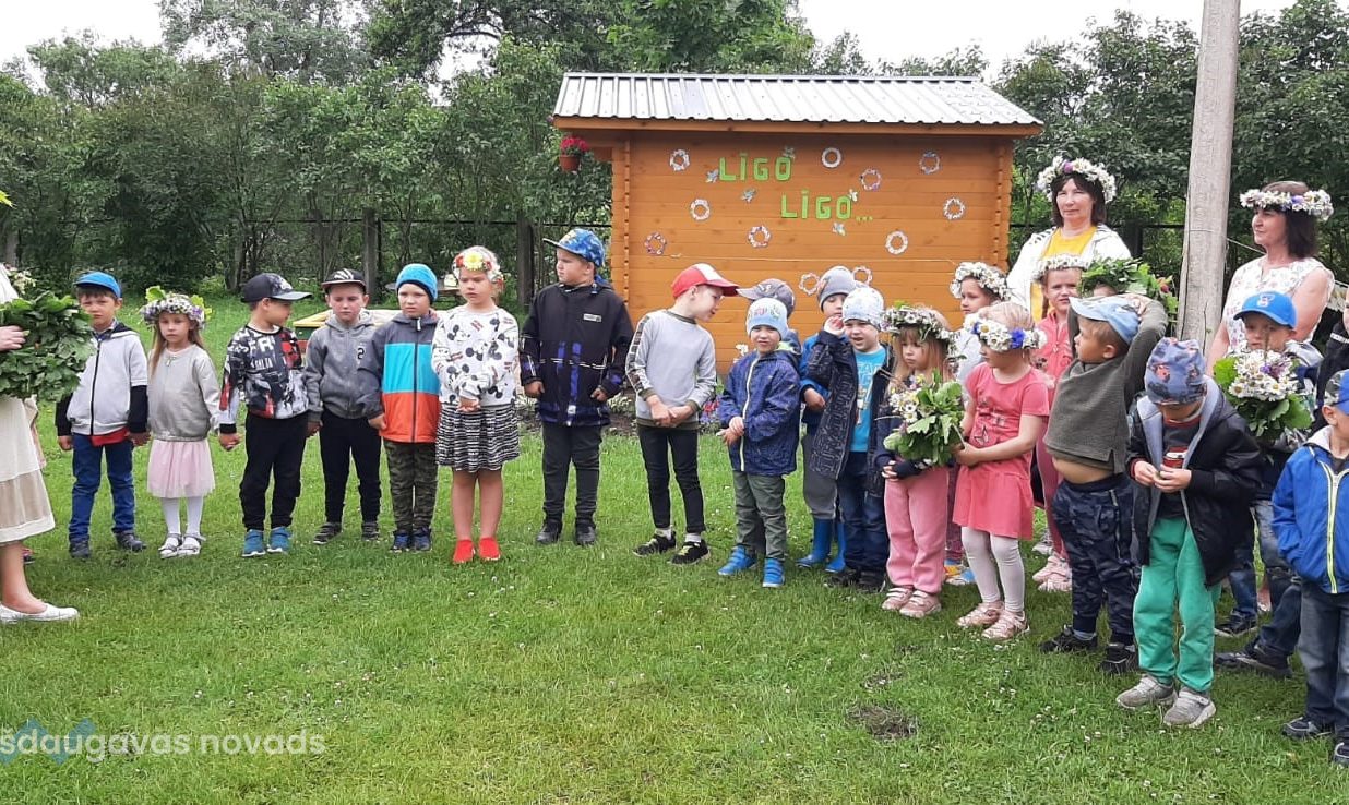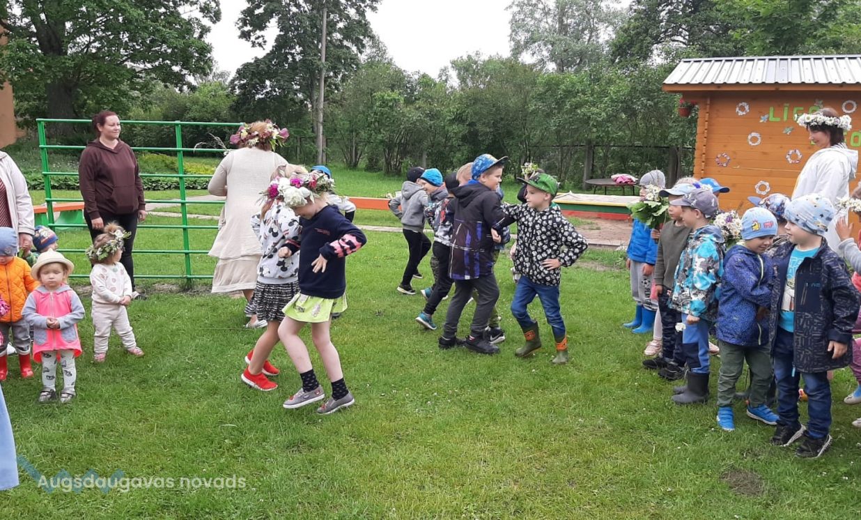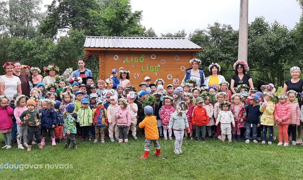 Šogad laiks īpaši mūs nelutina, bet tomēr īsi pirms vasaras Saulgriežiem, 21.jūnijā mums izdevās notvert mirkli un kārtīgi ielīgot latviskākos svētkus- Jāņus. Pirmssvētku rosība bija jūtama jau iepriekšējā nedēļā. Skolotājas palīdzēja bērniem iepazīt dažādus Līgo svētku faktus, tradicionālos ēdienus. Iepazina dažādus pļavā un dārzā augošus augus, puķes, vēroja un pētīja to atšķirīgās un kopīgās iezīmes. Bērni zīmēja, līmēja, veidoja dažādus radošus darbiņus, lielākie -mācījās pīt vainadziņus .Tika veidotas dekorācijas no pļavās salasītiem augiem un puķēm laukumu rotāšanai. Līgo vakars un Jāņi ir paši līksmākie svētki gadskārtā, tāpēc ielīgošanai jābūt lustīgai. Svētku laikā atsaucām atmiņā latviešu tautas tradīcijas, skaitījām tautas dziesmas, vienojāmies kopīgās dziesmās un rotaļās. Ar ozollapu vainadziņu suminājām mūsu Jāni - I.jaunākās grupas "Skudriņas" audzēkni. Kad visu gadu krātās dziesmas tika izdziedātas un rotaļas izspēlētas, tad lecām pāri ziedu ugunskuram un cienājāmies ar sieru . Paldies audzēkņu vecākiem par Jāņu zāļu un ziedu sagādi! Priecīgus un lustīgus vasaras saulgriežus!