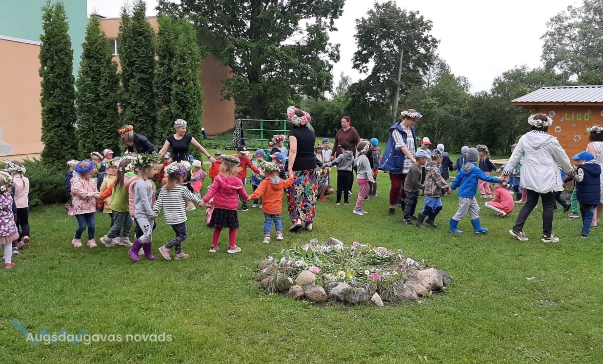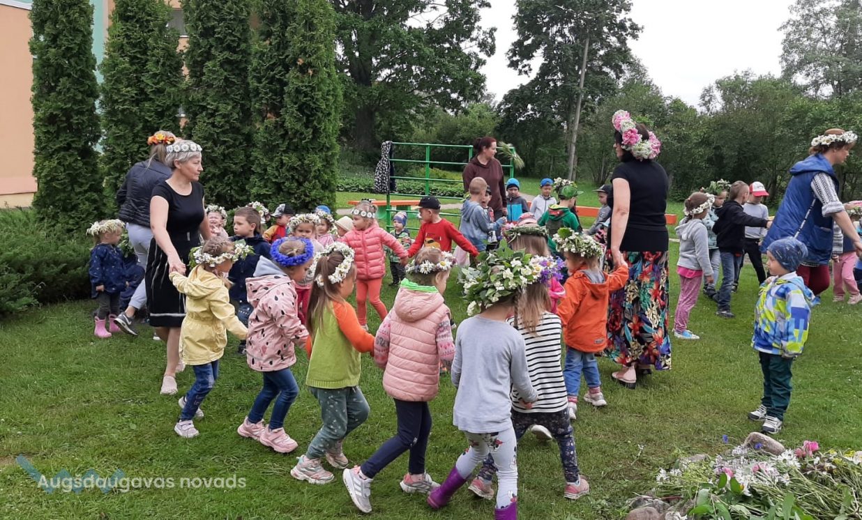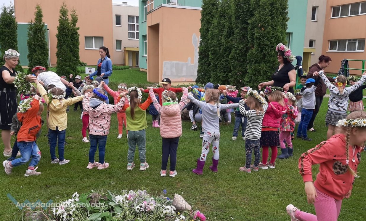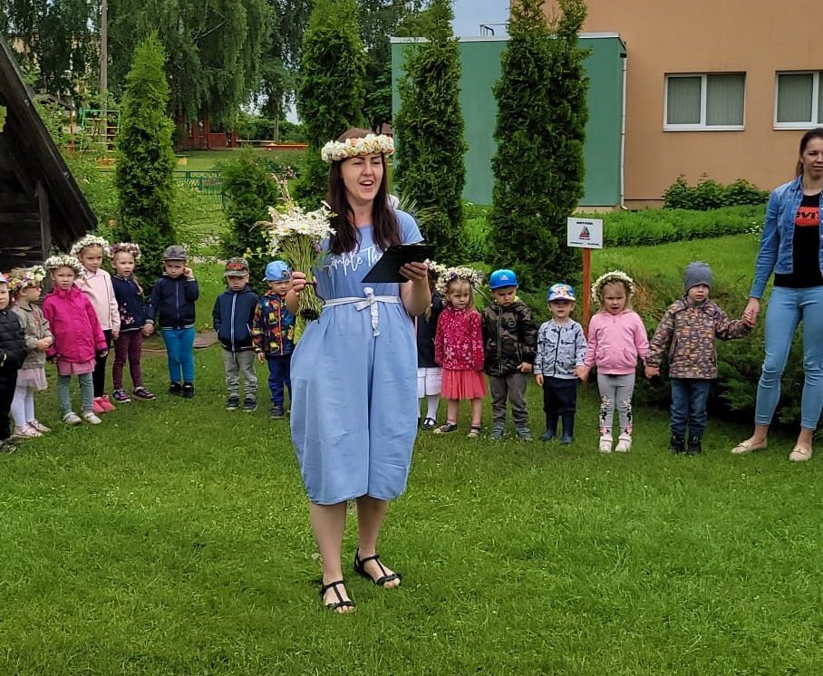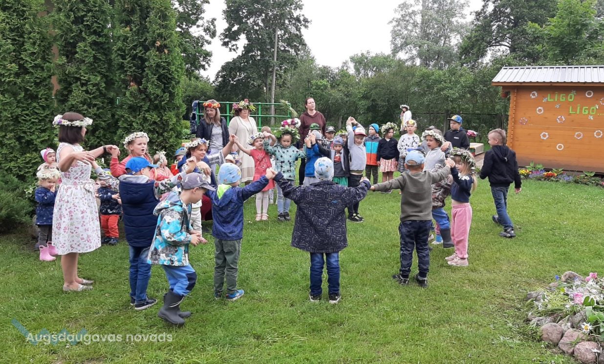 Šogad laiks īpaši mūs nelutina, bet tomēr īsi pirms vasaras Saulgriežiem, 21.jūnijā mums izdevās notvert mirkli un kārtīgi ielīgot latviskākos svētkus- Jāņus. Pirmssvētku rosība bija jūtama jau iepriekšējā nedēļā. Skolotājas palīdzēja bērniem iepazīt dažādus Līgo svētku faktus, tradicionālos ēdienus. Iepazina dažādus pļavā un dārzā augošus augus, puķes, vēroja un pētīja to atšķirīgās un kopīgās iezīmes. Bērni zīmēja, līmēja, veidoja dažādus radošus darbiņus, lielākie -mācījās pīt vainadziņus .Tika veidotas dekorācijas no pļavās salasītiem augiem un puķēm laukumu rotāšanai. Līgo vakars un Jāņi ir paši līksmākie svētki gadskārtā, tāpēc ielīgošanai jābūt lustīgai. Svētku laikā atsaucām atmiņā latviešu tautas tradīcijas, skaitījām tautas dziesmas, vienojāmies kopīgās dziesmās un rotaļās. Ar ozollapu vainadziņu suminājām mūsu Jāni - I.jaunākās grupas "Skudriņas" audzēkni. Kad visu gadu krātās dziesmas tika izdziedātas un rotaļas izspēlētas, tad lecām pāri ziedu ugunskuram un cienājāmies ar sieru . Paldies audzēkņu vecākiem par Jāņu zāļu un ziedu sagādi! Priecīgus un lustīgus vasaras saulgriežus!