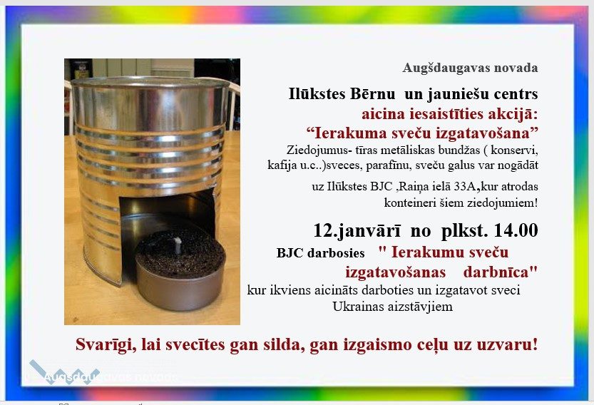 12. janvārī no plkst.14.00 Augšdaugavas novada Ilūkstes Bērnu un jauniešu centrs aicina iesaistīties akcijā "Ierakumu sveču izgatavošana".