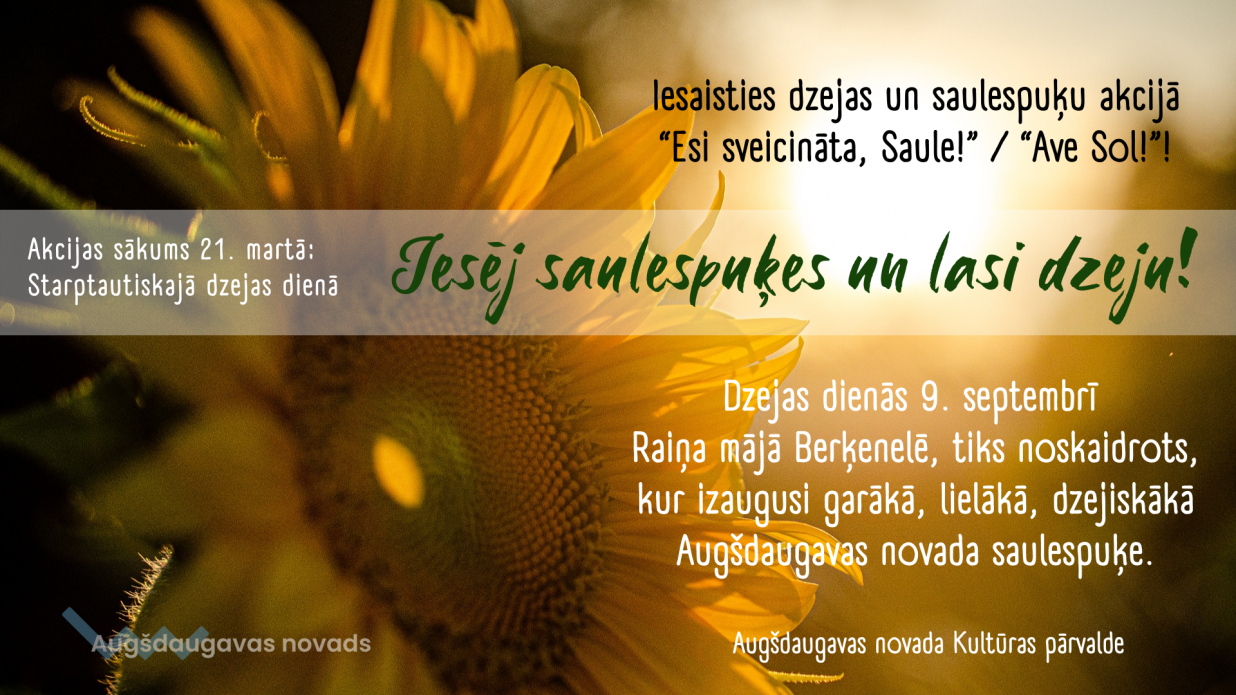 Starptautiskajā dzejas dienā, 21. martā, Augšdaugavas novada Kultūras pārvalde izsludina pavasarīgu dzejas un saulespuķu akciju “Esi sveicināta, Saule!”. Akcijas nosaukuma pamatā ir Raiņa saules dziesmas jeb poēmas “Ave Sol!” latviskotais nosaukums. Novada iedzīvotāji un iestādes tiek aicināti sēt saulespuķes un lasīt dzeju.
