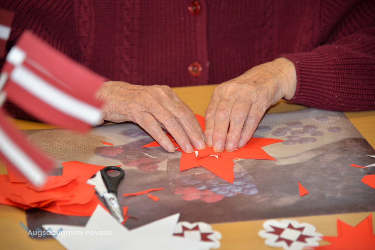 Pirms Valsts svētkiem “Senioru Rezidences” iemītnieki pulcējās zālē, lai piedalītos ikdienas nodarbībā ar sociālo rehabilitoloģi Ludmilu Gladiševu. Šoreiz bija tēma – svētku dekora izgatavošana. Seniori izgriež no krāsaina papīra Latvijas simbolus un veido skaistas kompozīcijas, kuras var, piemēram, piespraust pie apģērba vai izveidot no tiem atklātnes. No malas var šķist, ka tas ir viegli, tomēr tā nav – dažiem ir ļoti grūti pat noturēt rokās šķēres, citiem ir slikta redze, bet seniori ļoti cenšas, jo vajag saglabāt un attīstīt sīkās motorikas pamatus.