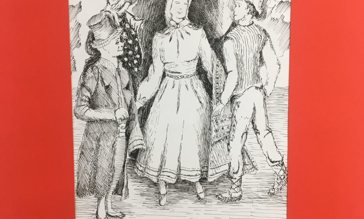 Lauras Sutiņas-Zutiņas darbs “Tautumeitas stingrie sargi”, ilustrējot latviešu tautasdziesmu