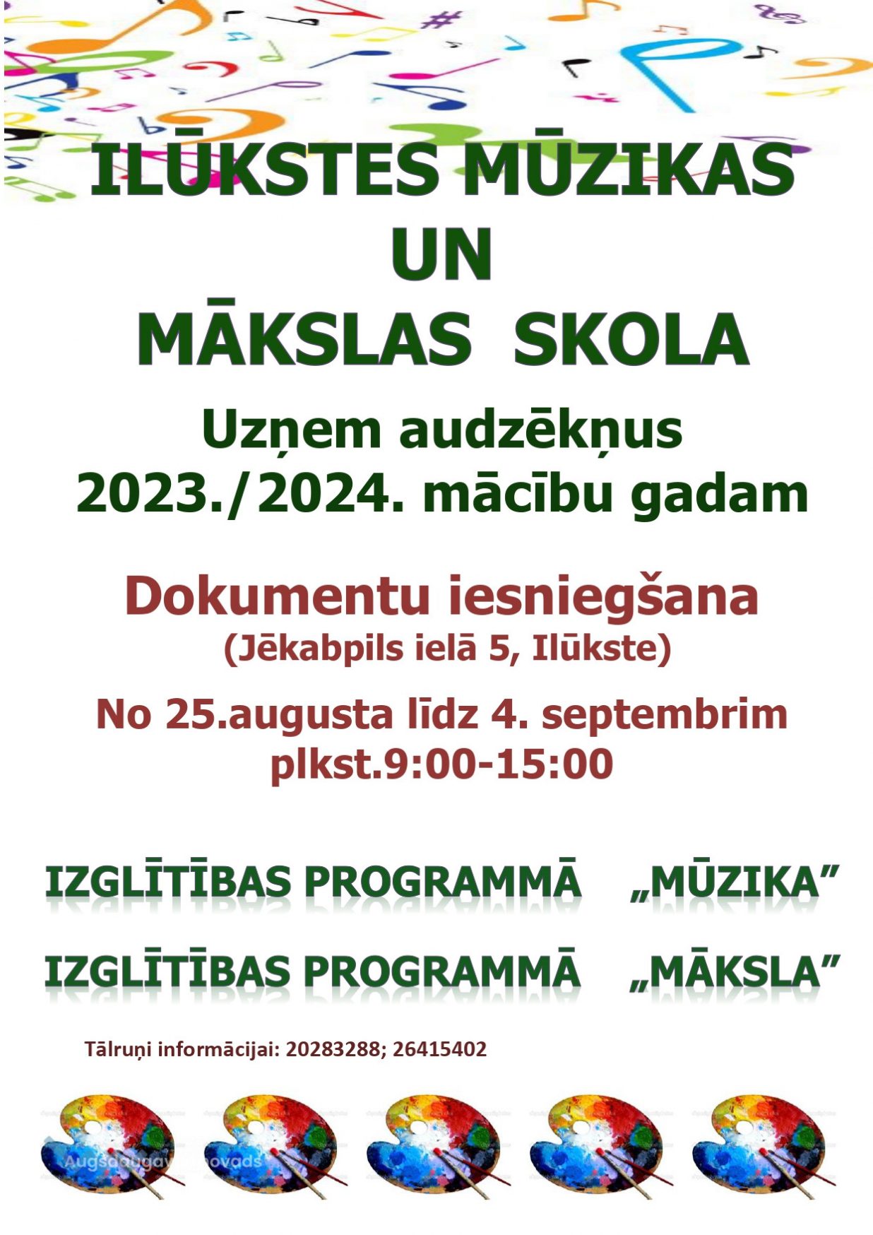 Ilūkstes Mūzikas un mākslas skola uzņem audzēkņus25.08.2023AKTUĀLI Ilūkstes Mūzikas un mākslas skola uzņem audzēkņus 2023./2024.mācību gadam.Dokumentu iesniegšana no 25. augusta līdz 4. septembrim Jēkabpils 5, Ilūkste, plkst. 9.00 - 15.00. Izglītības programmas: “Māksla” un “Mūzika”. Saziņai: 20283288; 26415402.