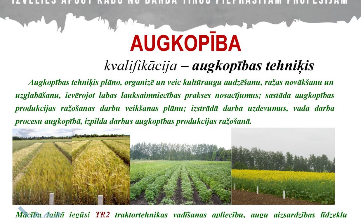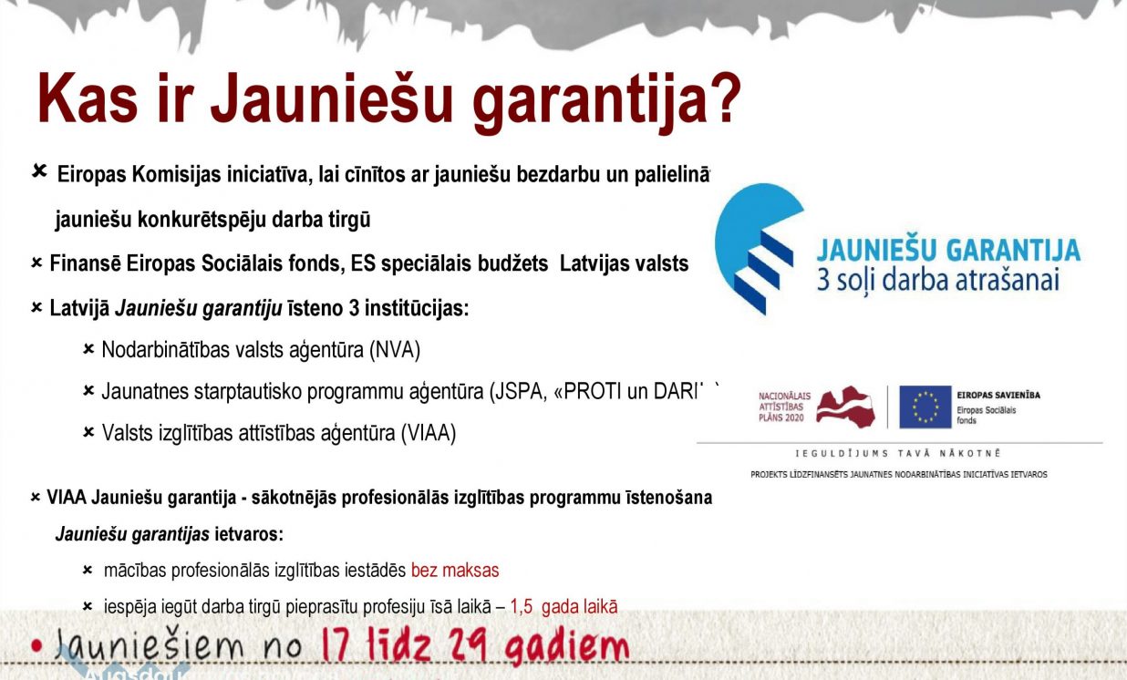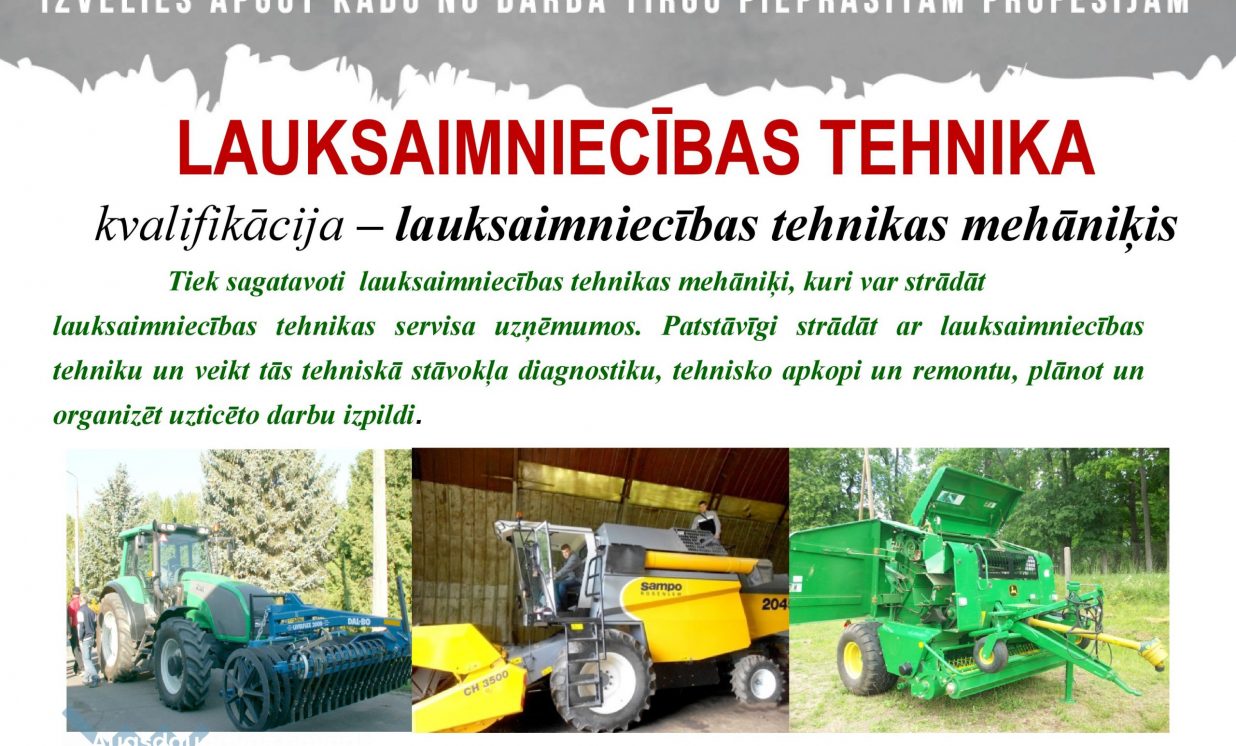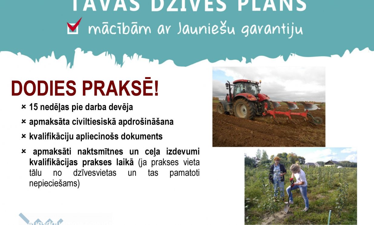 Tiek uzņemti jaunieši ar vidusskolas izglītību no 17 līdz 29 gadiem divās Jauniešu garantijas programmās. Programmā “Lauksaimniecības tehnika” ar kvalifikāciju lauksaimniecības tehnikas mehāniķis. Programmā tiek sagatavoti lauksaimniecības tehnikas mehāniķi, kuri var strādāt lauksaimniecības tehnikas servisa uzņēmumos. Mācību laikā tiek iegūta arī TR 2 traktortehnikas vadīšanas apliecība. Mācības ir bez maksas. Otrā programma “Augkopība” ar kvalifikāciju “augkopības tehniķis”. Mācību laikā tiek iegūta arī TR 2 traktortehnikas vadīšanas apliecība un augu aizsardzības līdzekļu lietošanas apliecība. Tā ir vienreizēja iespēja apgūt darba tirgū pieprasītu profesiju vien pusotra gada laikā. Mācības bez maksas.